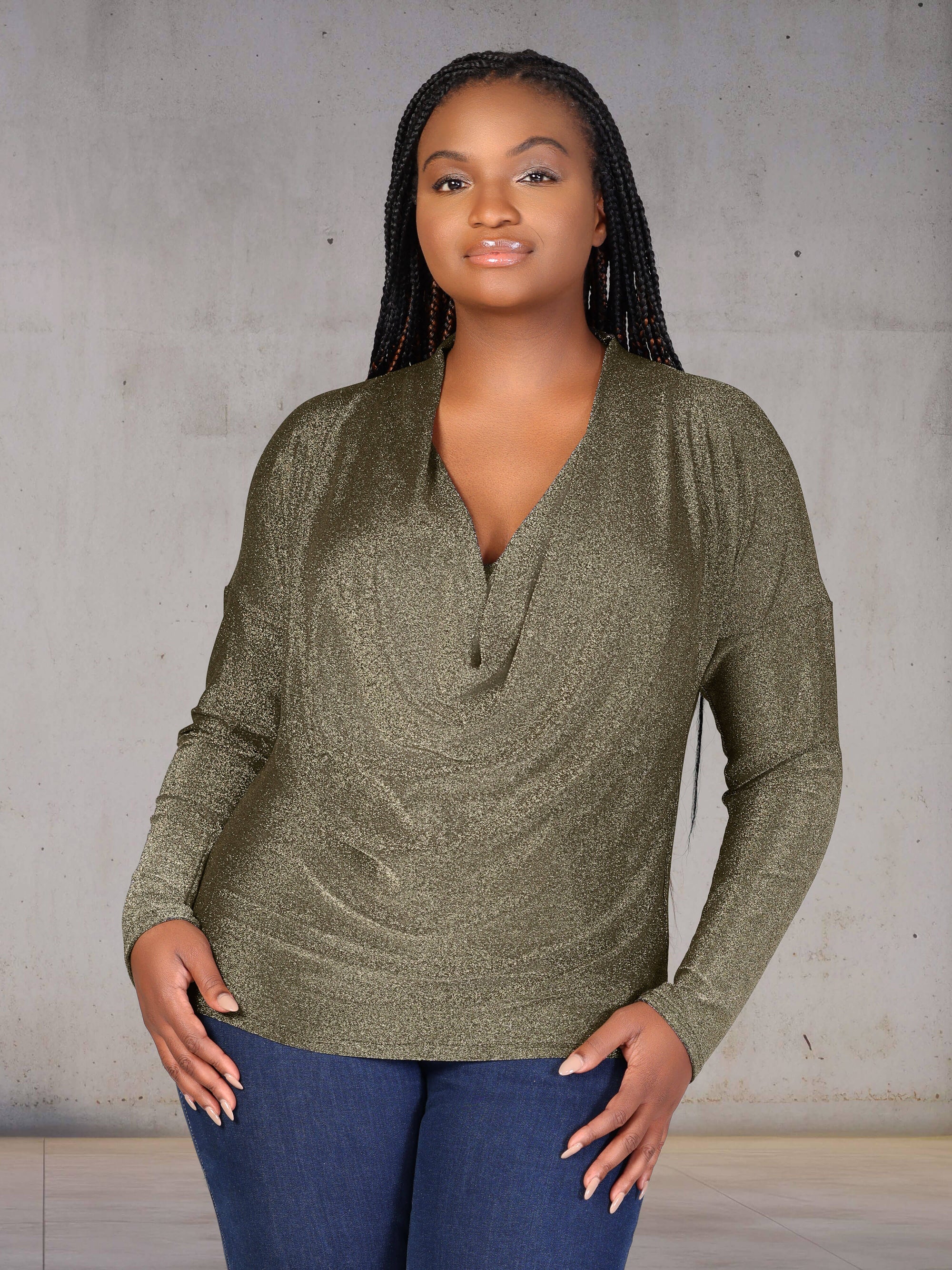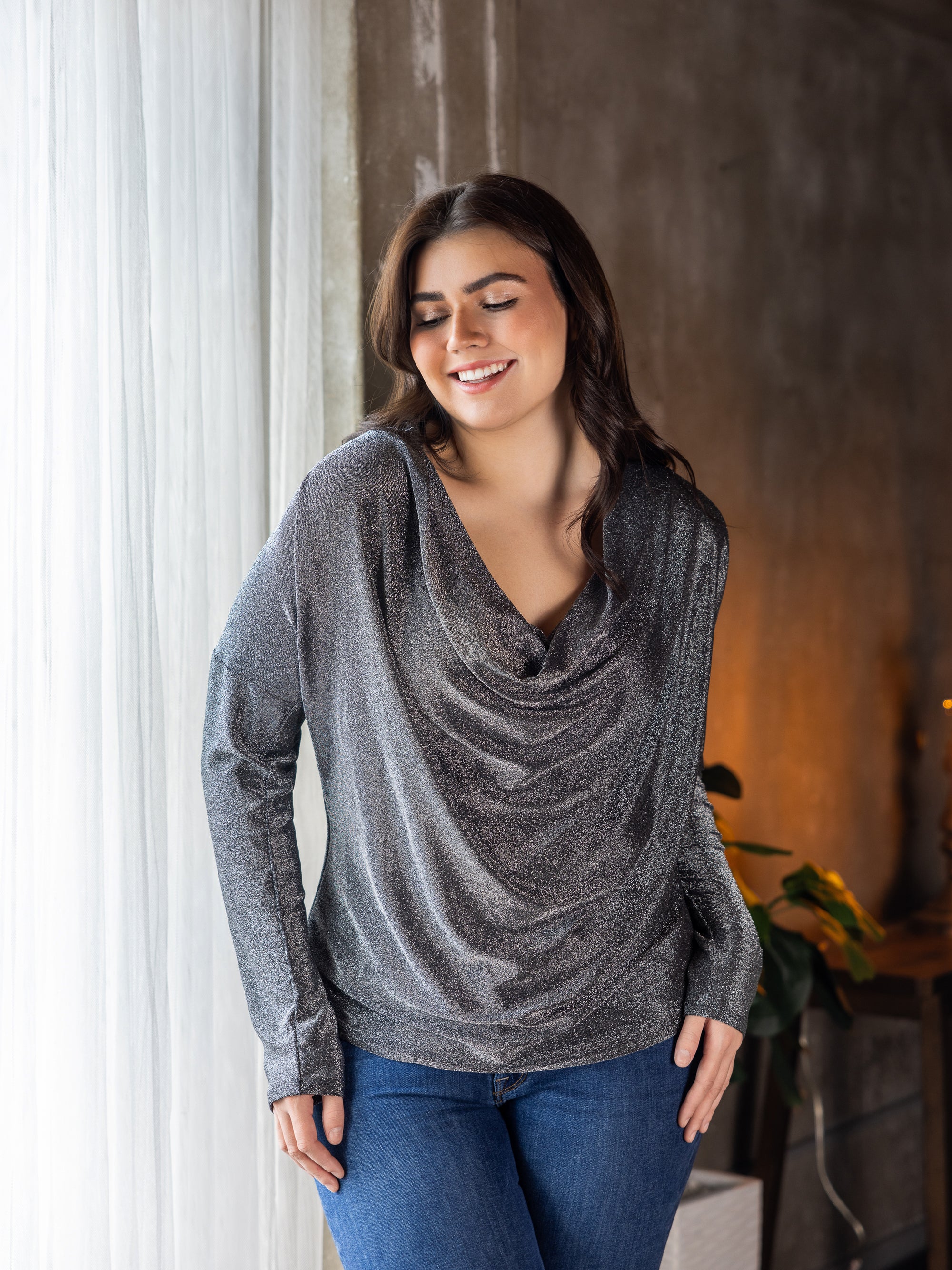 Plus Size Cowl Neck Long Sleeve Shimmery Fabric Top