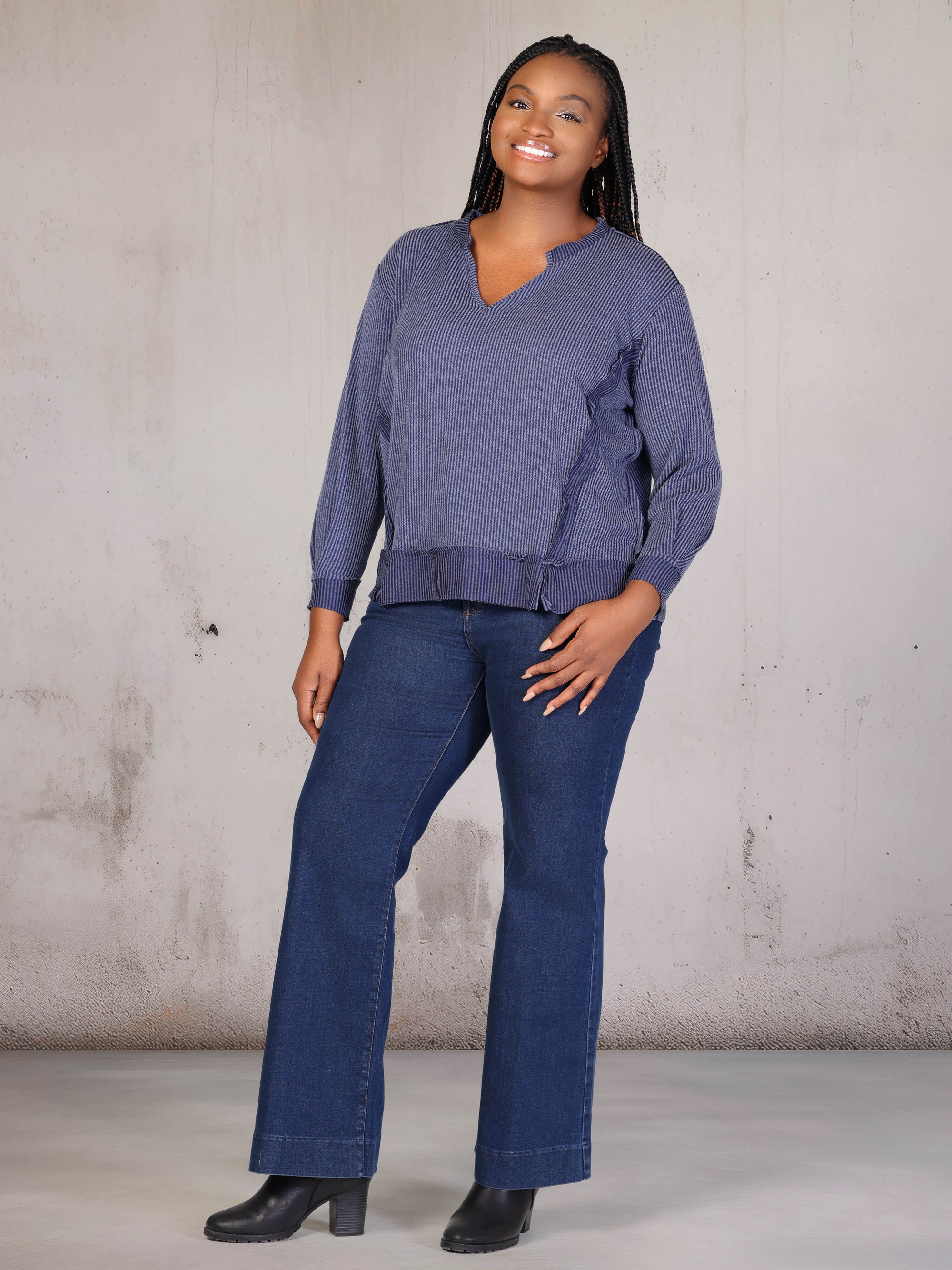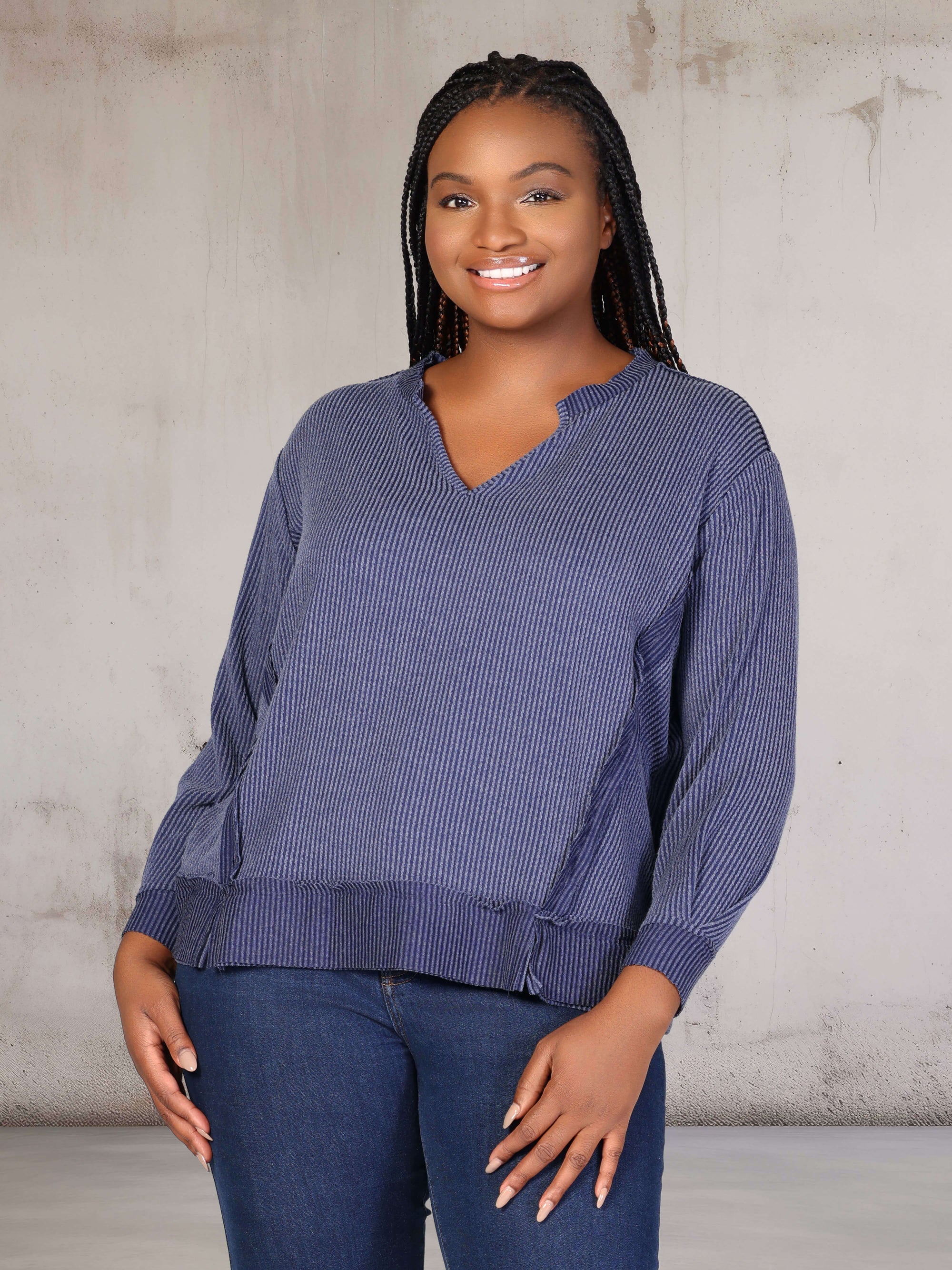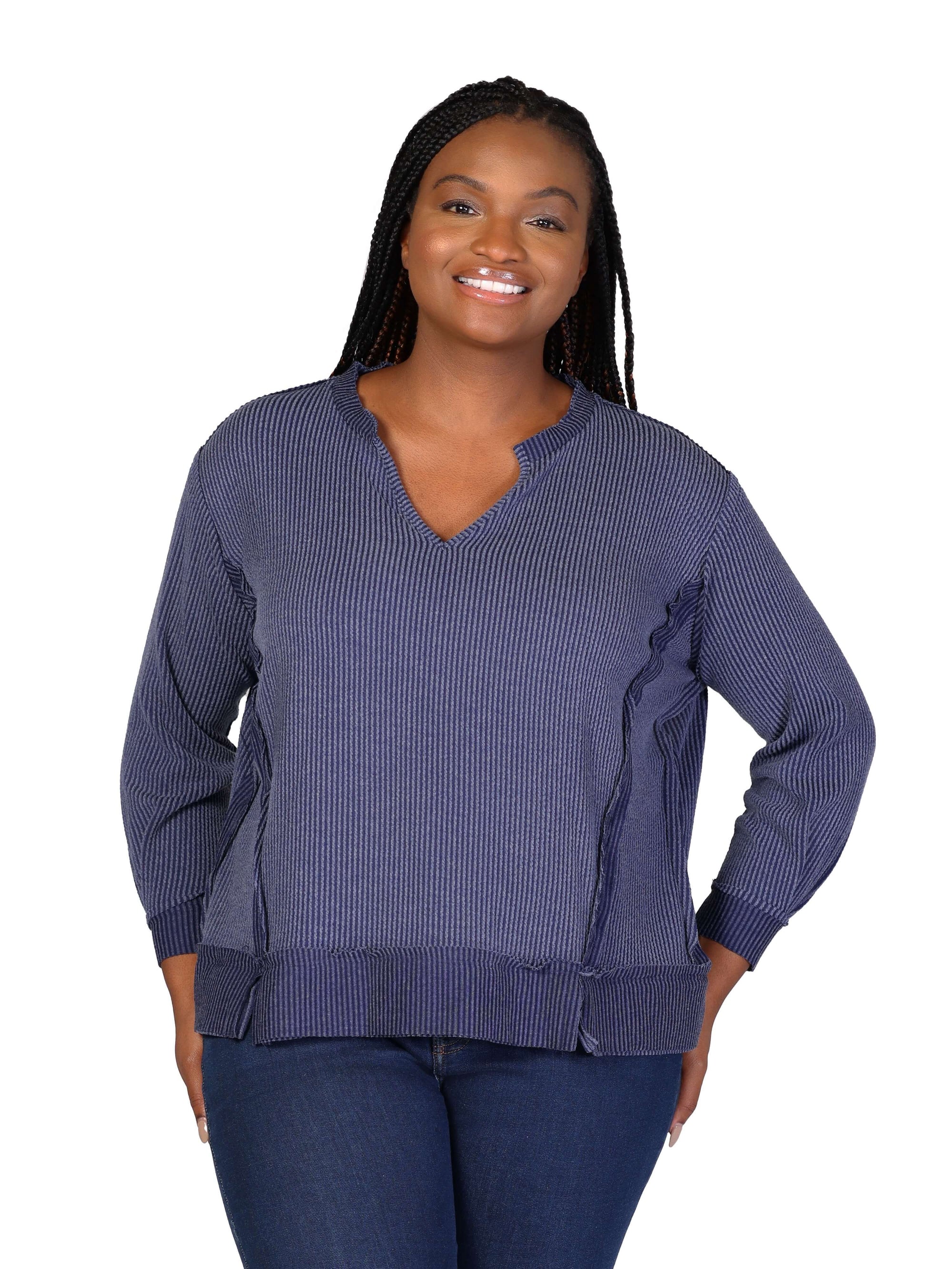 Plus Size Relaxed Fit Ribbed Knit V Neck Sweatshirt Top