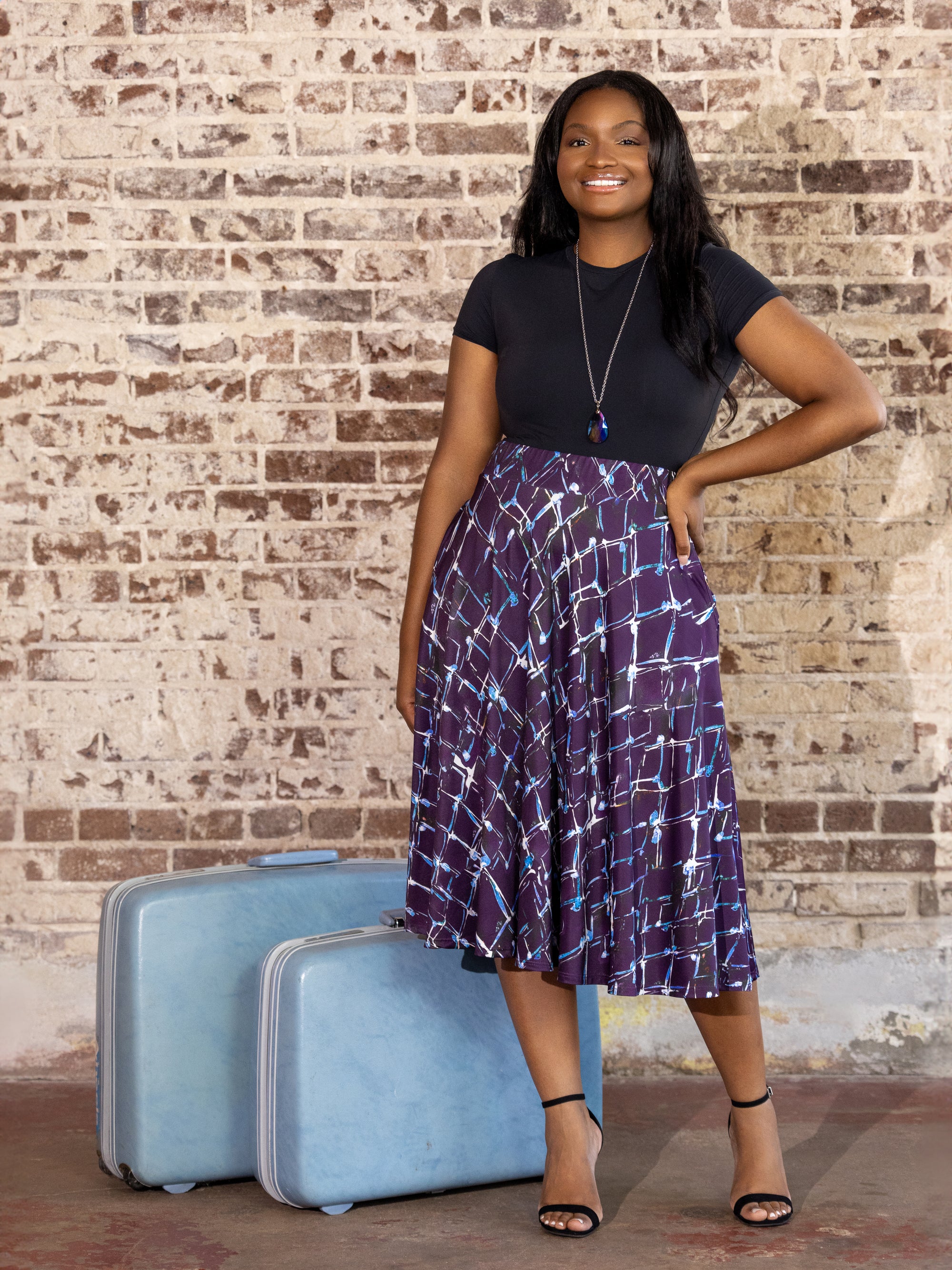 Plus Size Purple Print Elastic Waist Pocket Midi Skirt