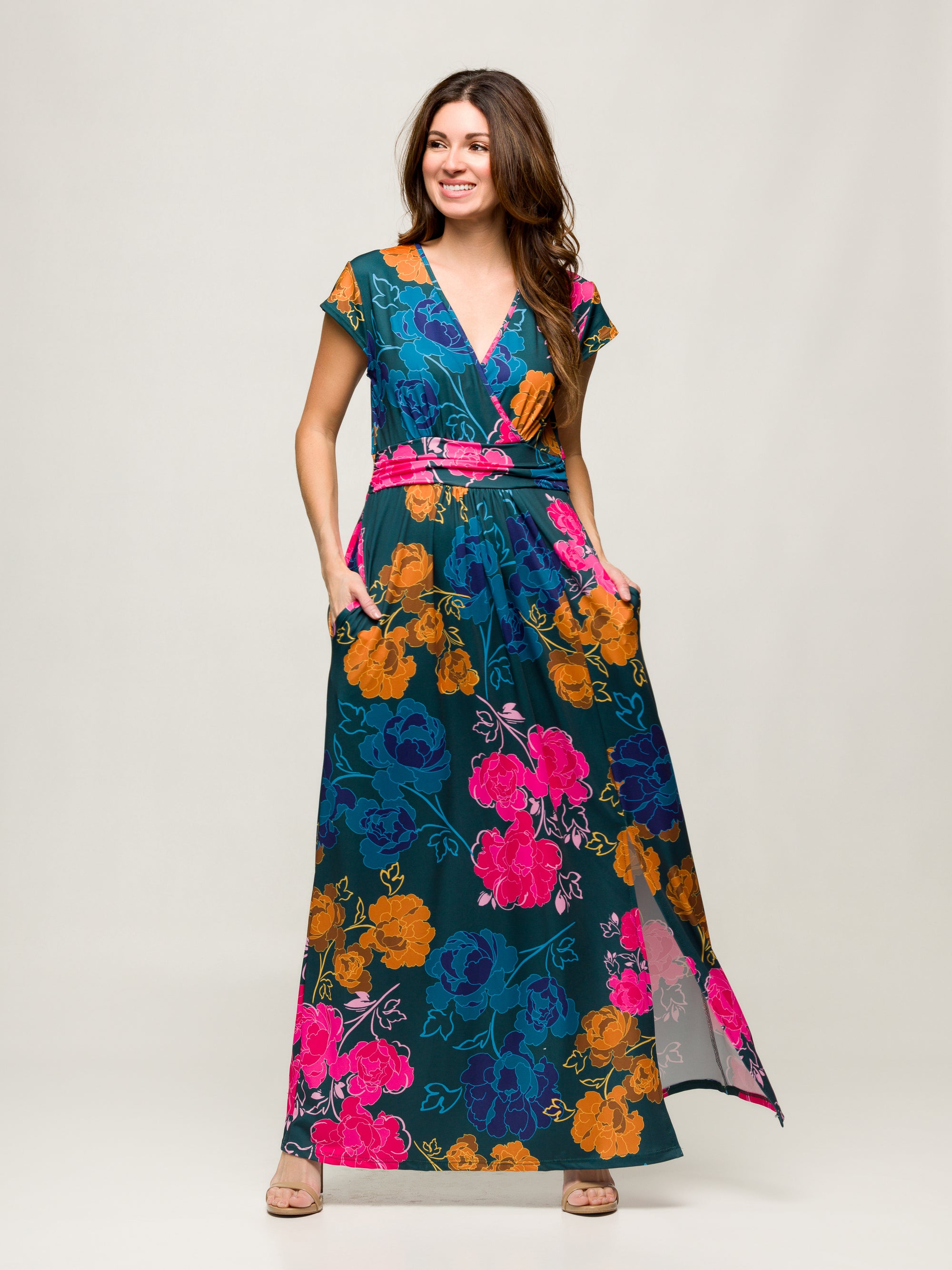 24seven Comfort Apparel Womens Floral Print Cap Sleeve V Neck Side Slit Pocket Maxi Dress