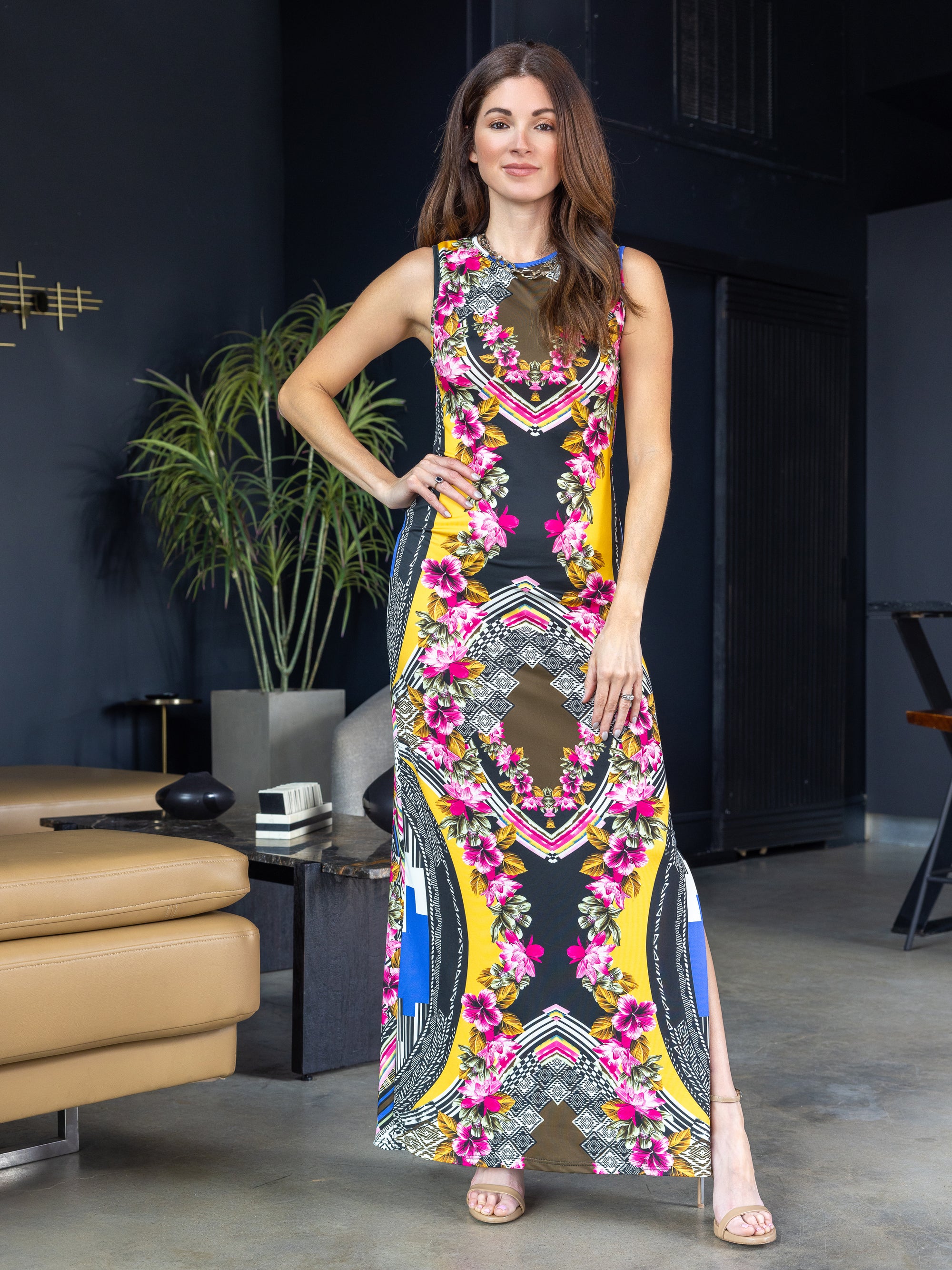 24seven Comfort Apparel Womens Geometric Floral Print Sleeveless Side Slit Maxi Dress