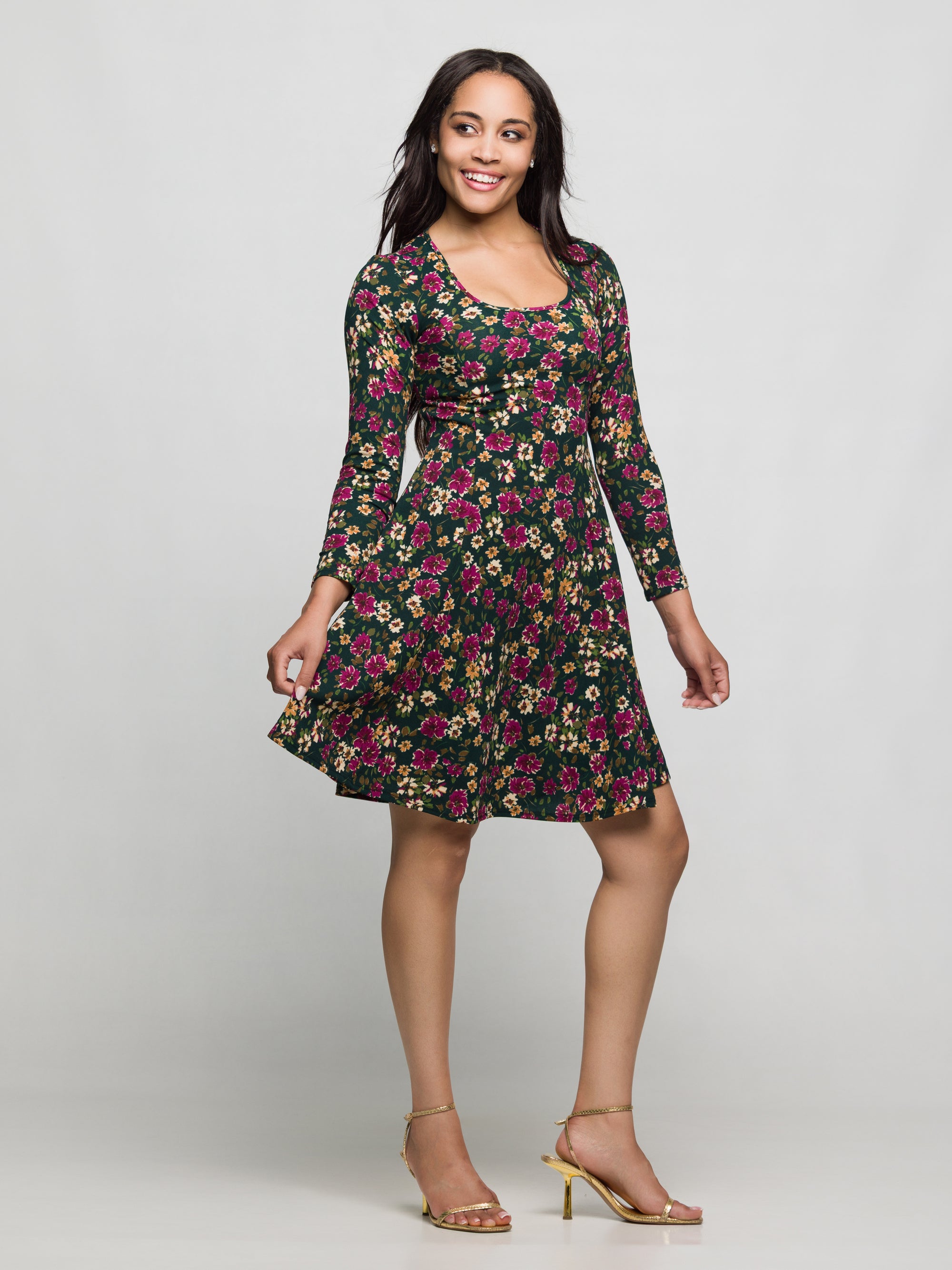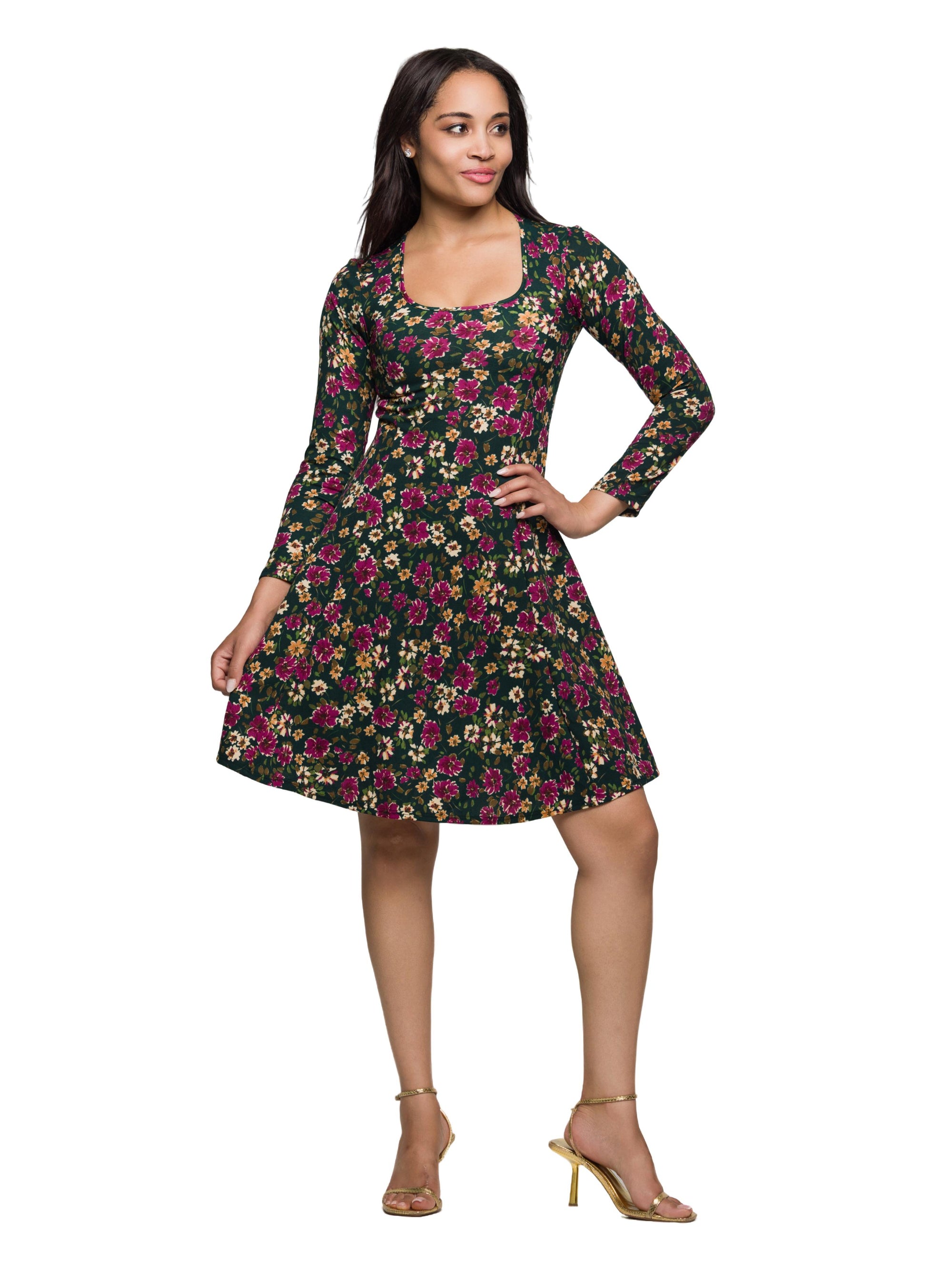 24seven Comfort Apparel Floral Print Long Sleeve Fit and Flare Mini Dress