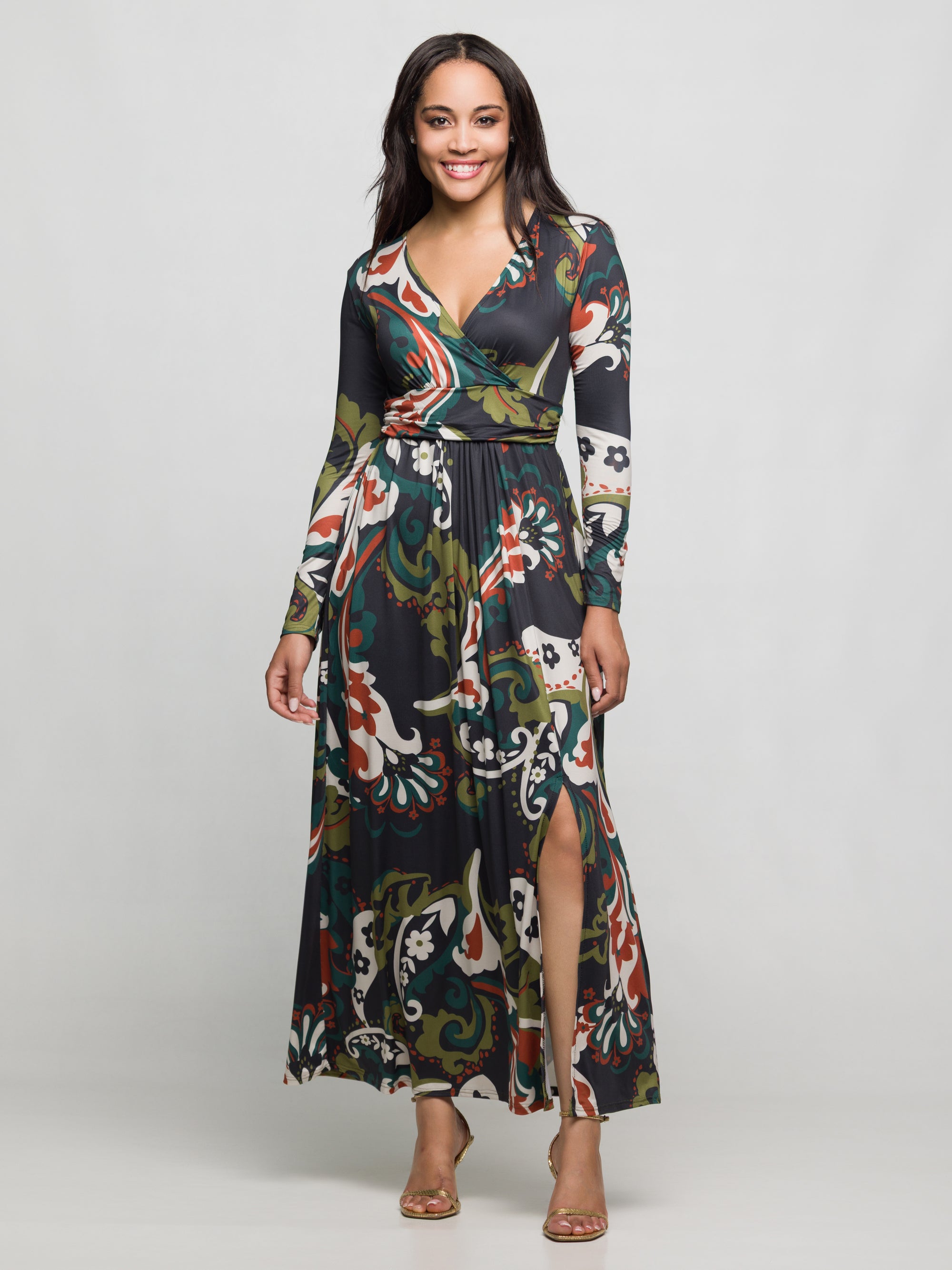 24seven Comfort Apparel Green Paisley Print Long Sleeve Wrap Maxi Dress