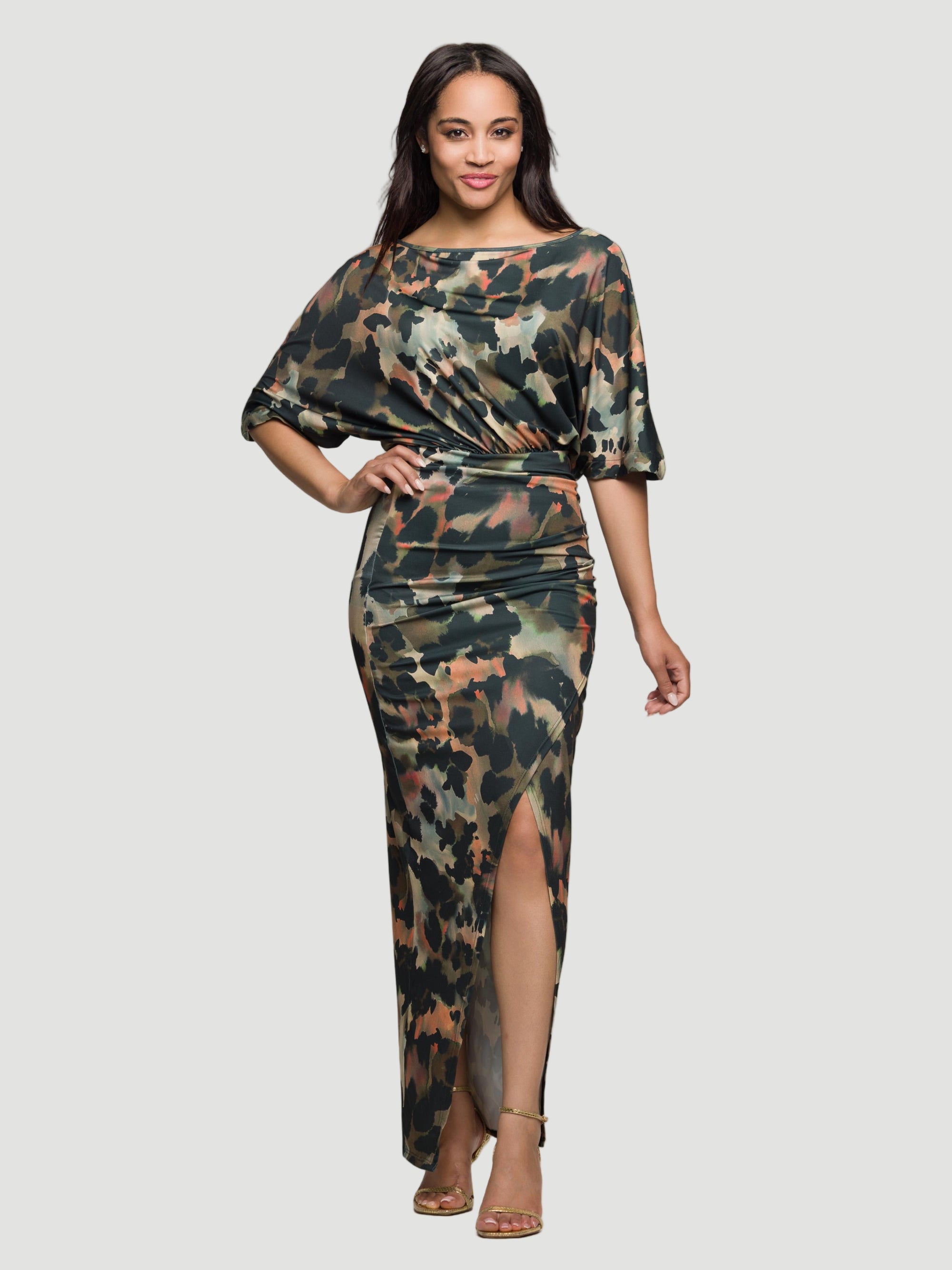 24seven Comfort Apparel Green Abstract Print Batwing Sleeve Maxi Dress with Slit