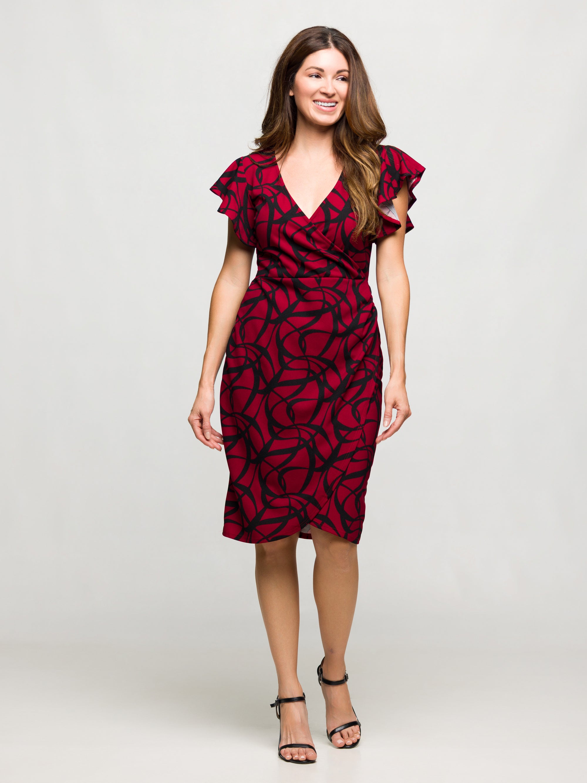 24seven Comfort Apparel Burgundy Print Flutter Sleeve Faux Wrap Dress