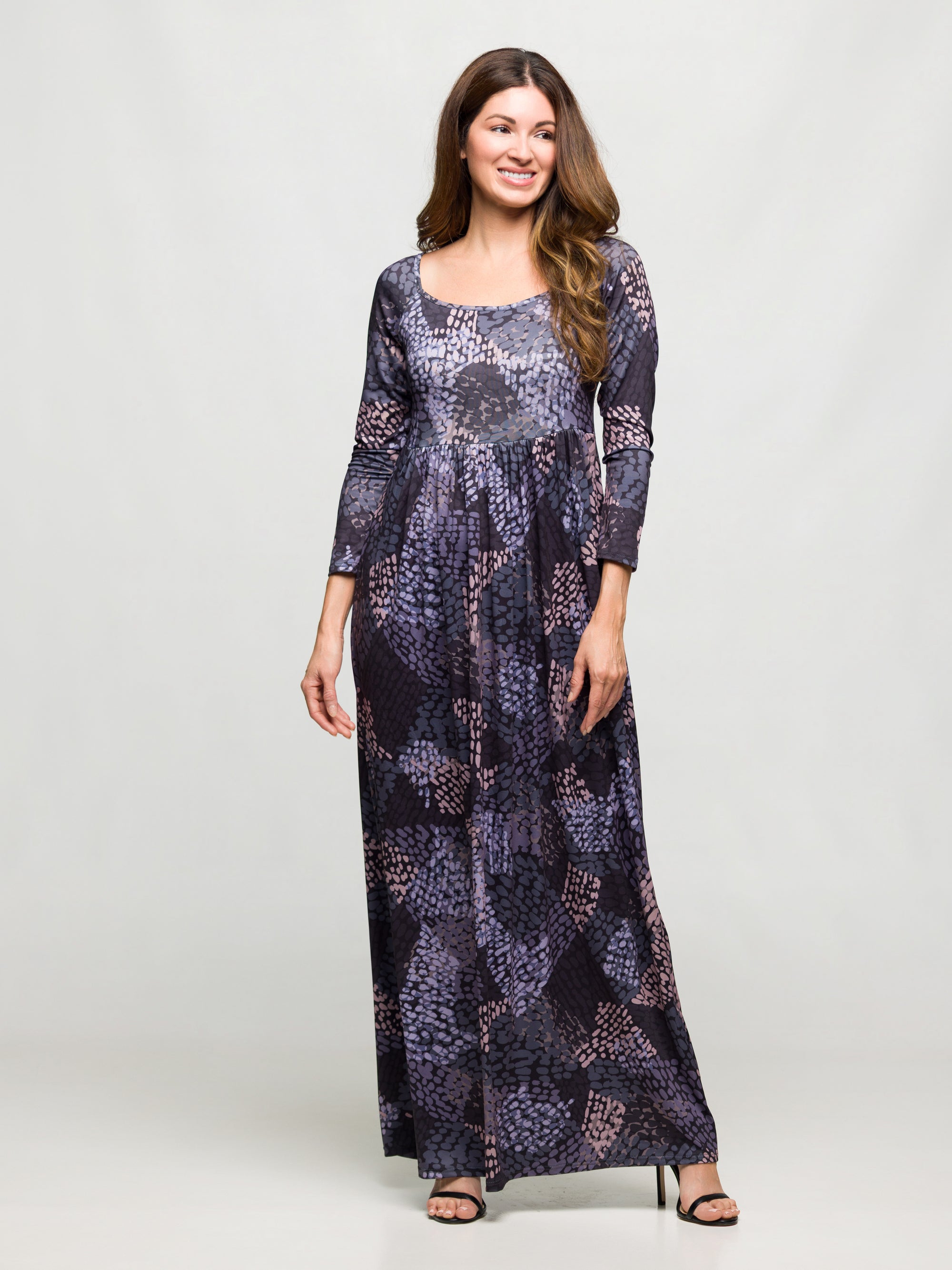 24seven Comfort Apparel Long Sleeve Empire Waist Maxi Dress in Grey Print