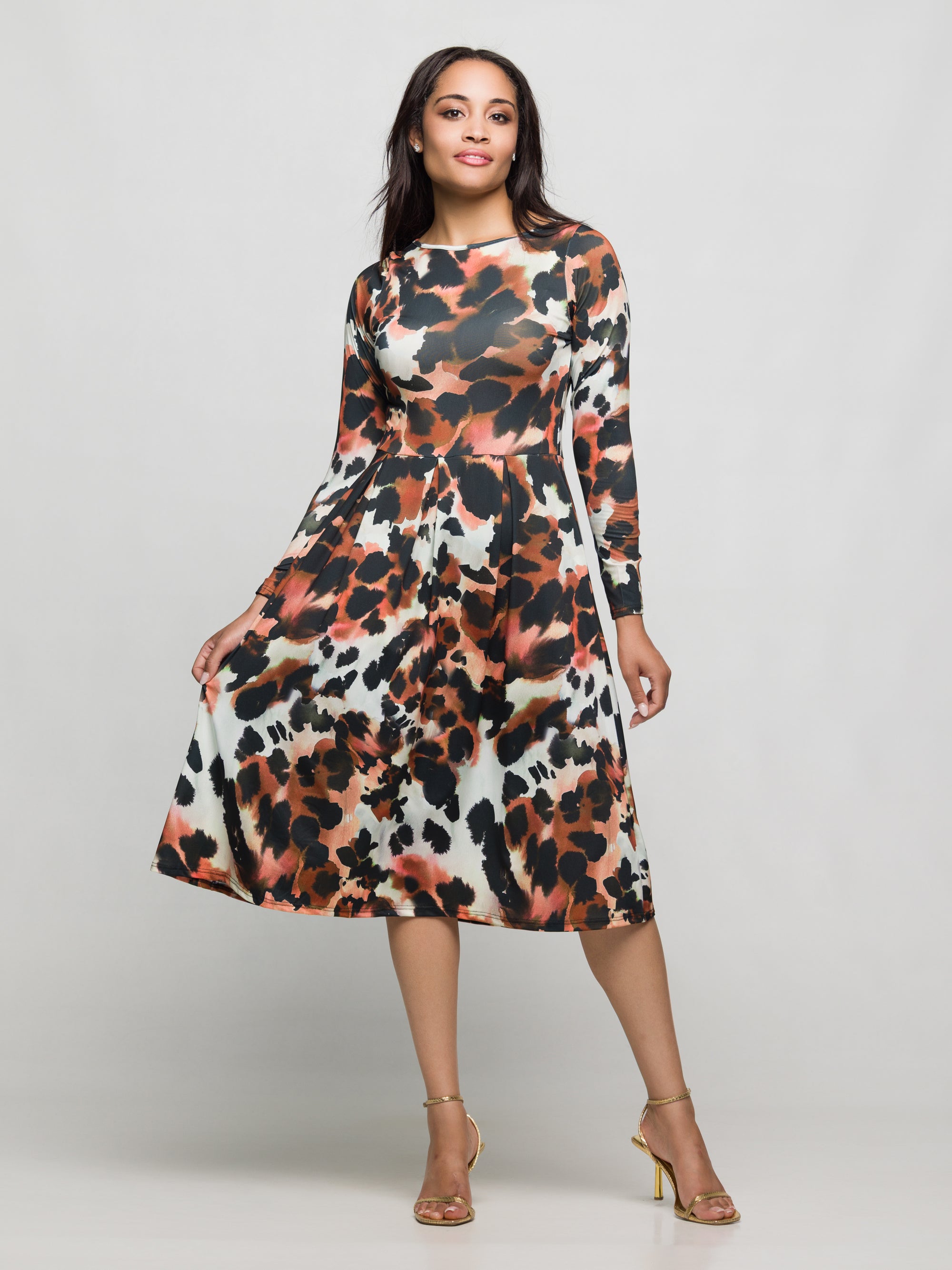 24seven Comfort Apparel Long Sleeve Midi Dress in Animal Print