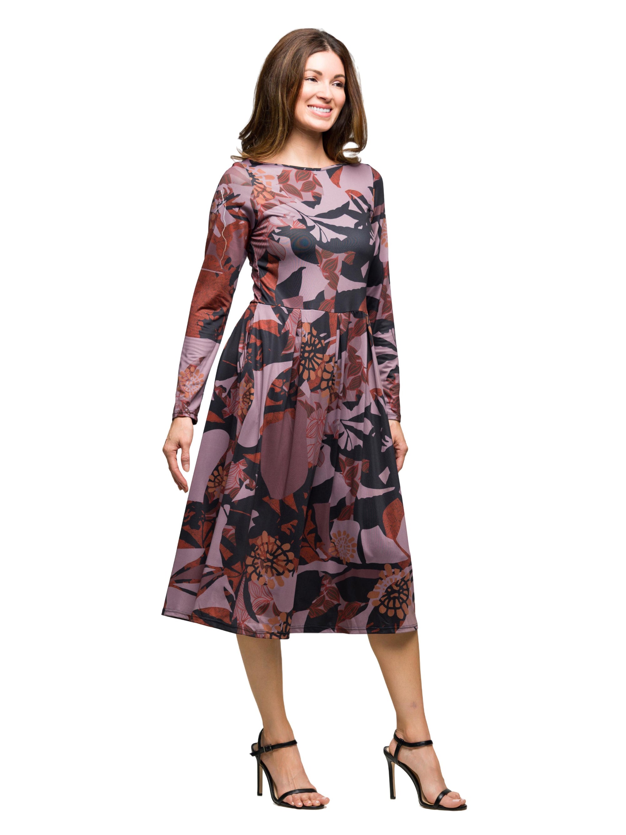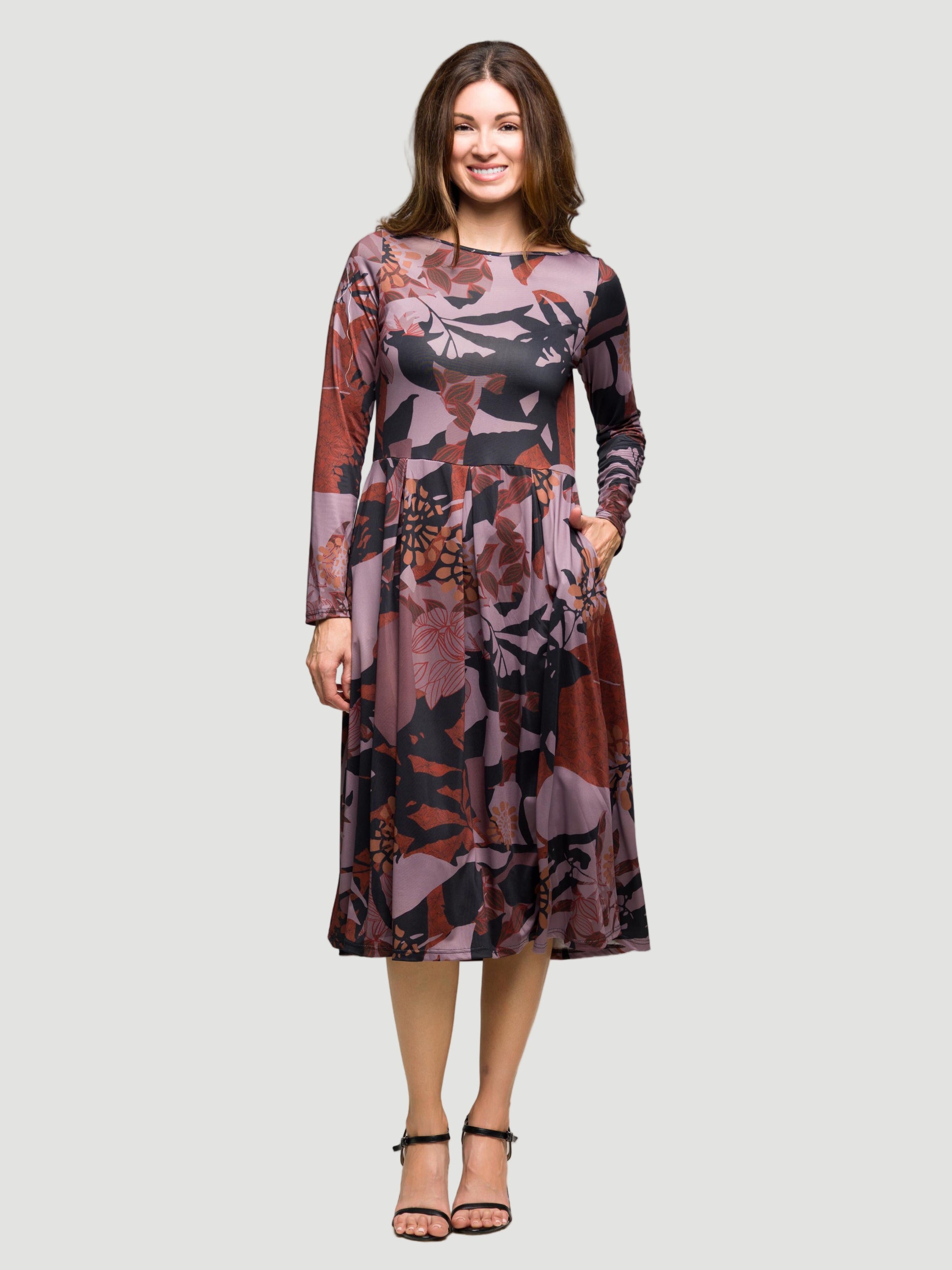 24seven Comfort Apparel Long Sleeve Midi Dress Brown Floral Print