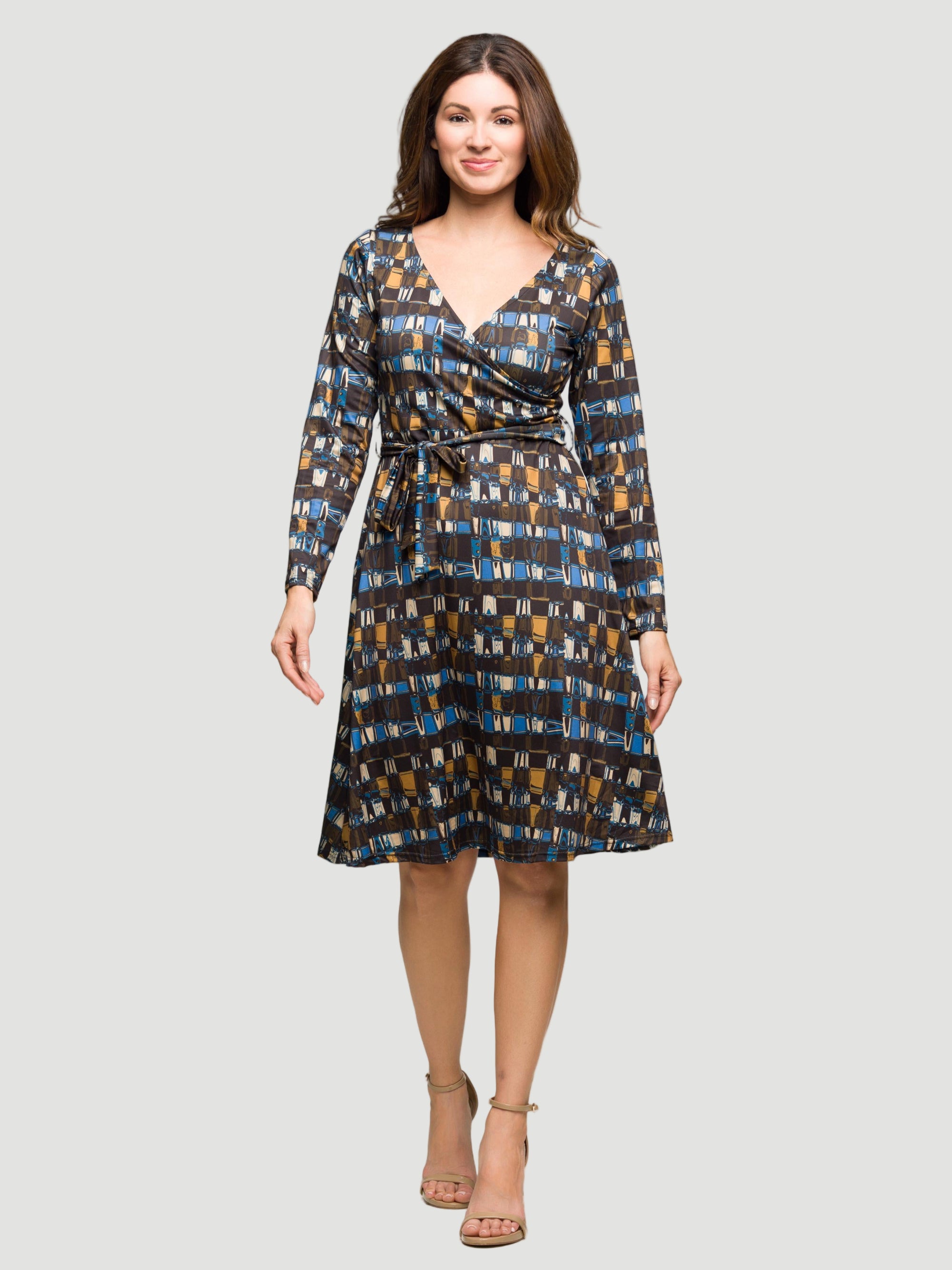 24seven Comfort Apparel Long Sleeve Wrap Dress with Belt in Brown Blue Geometric Print