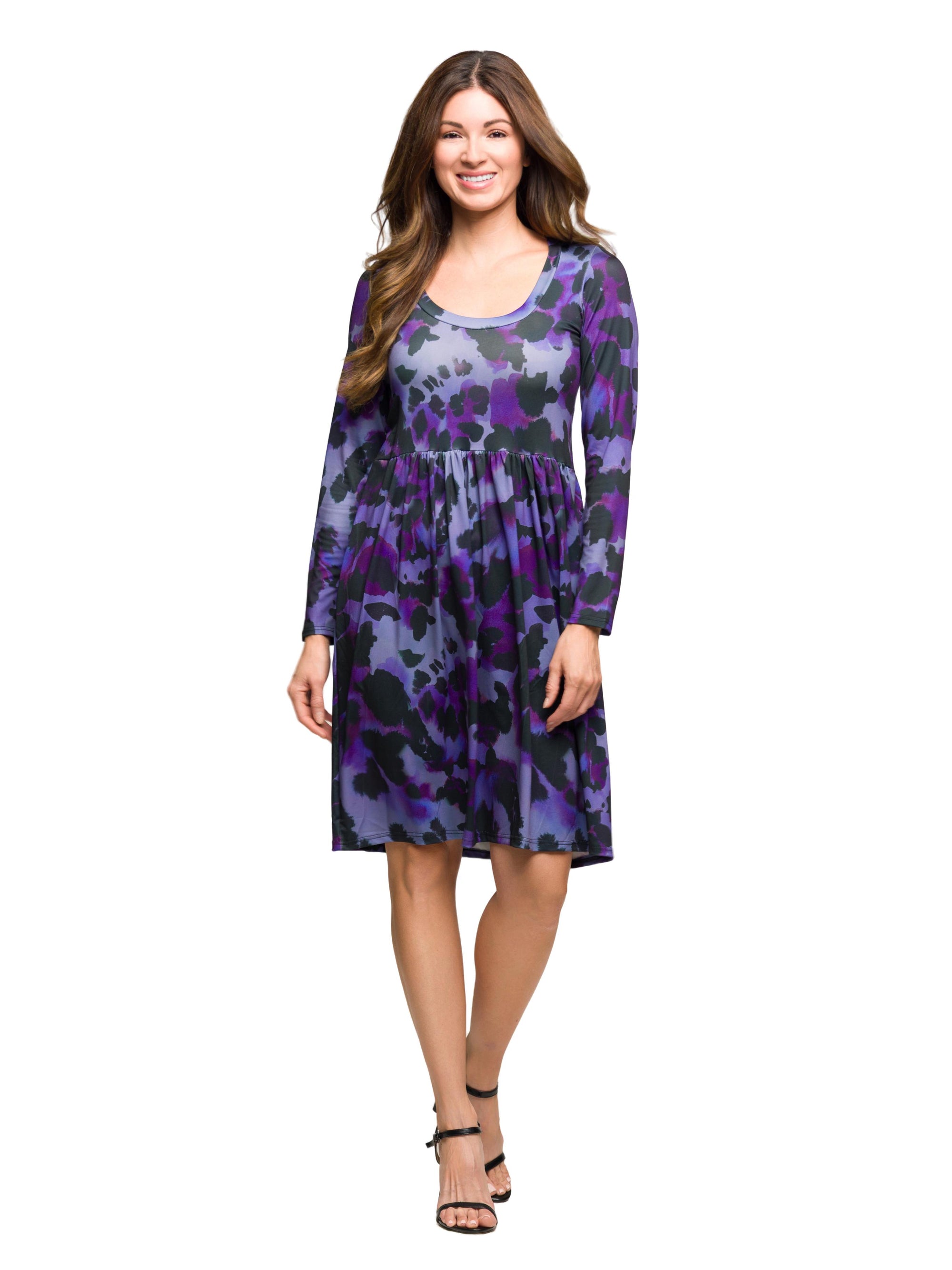24seven Comfort Apparel Long Sleeve Empire Waist Dress Purple Black Print