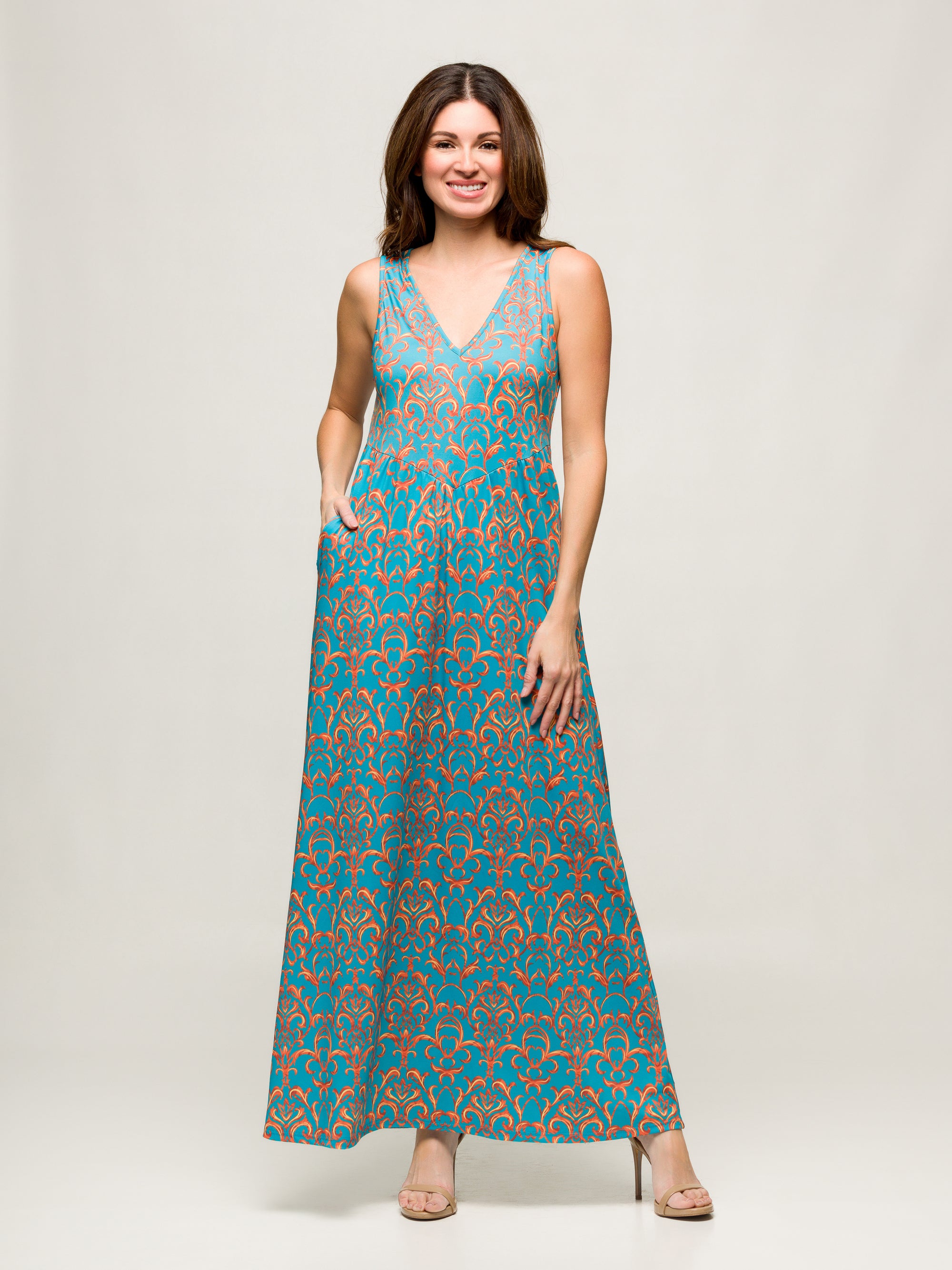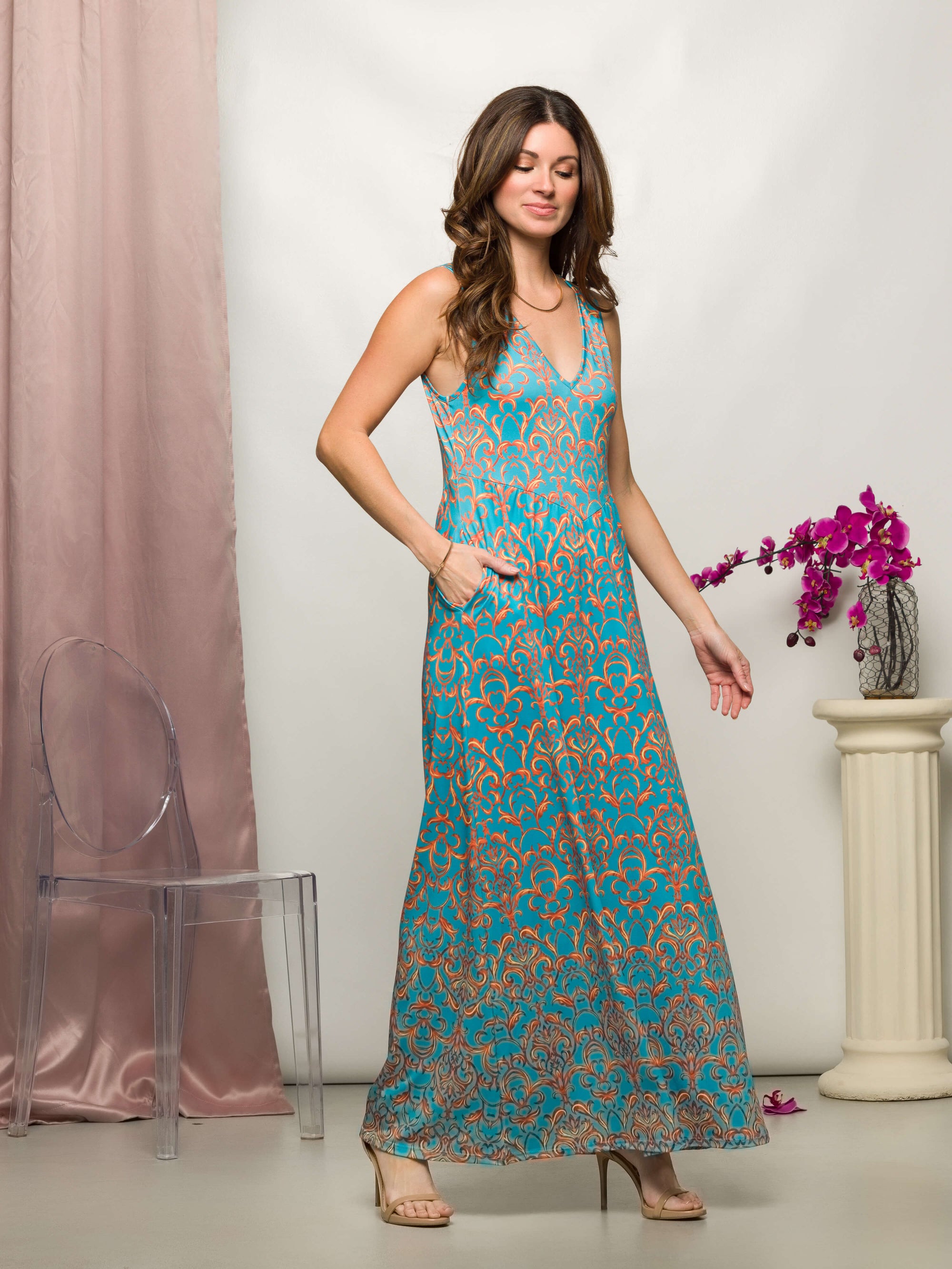 24seven Comfort Apparel Sky Blue Sleeveless V Neck Maxi Dress With Pockets