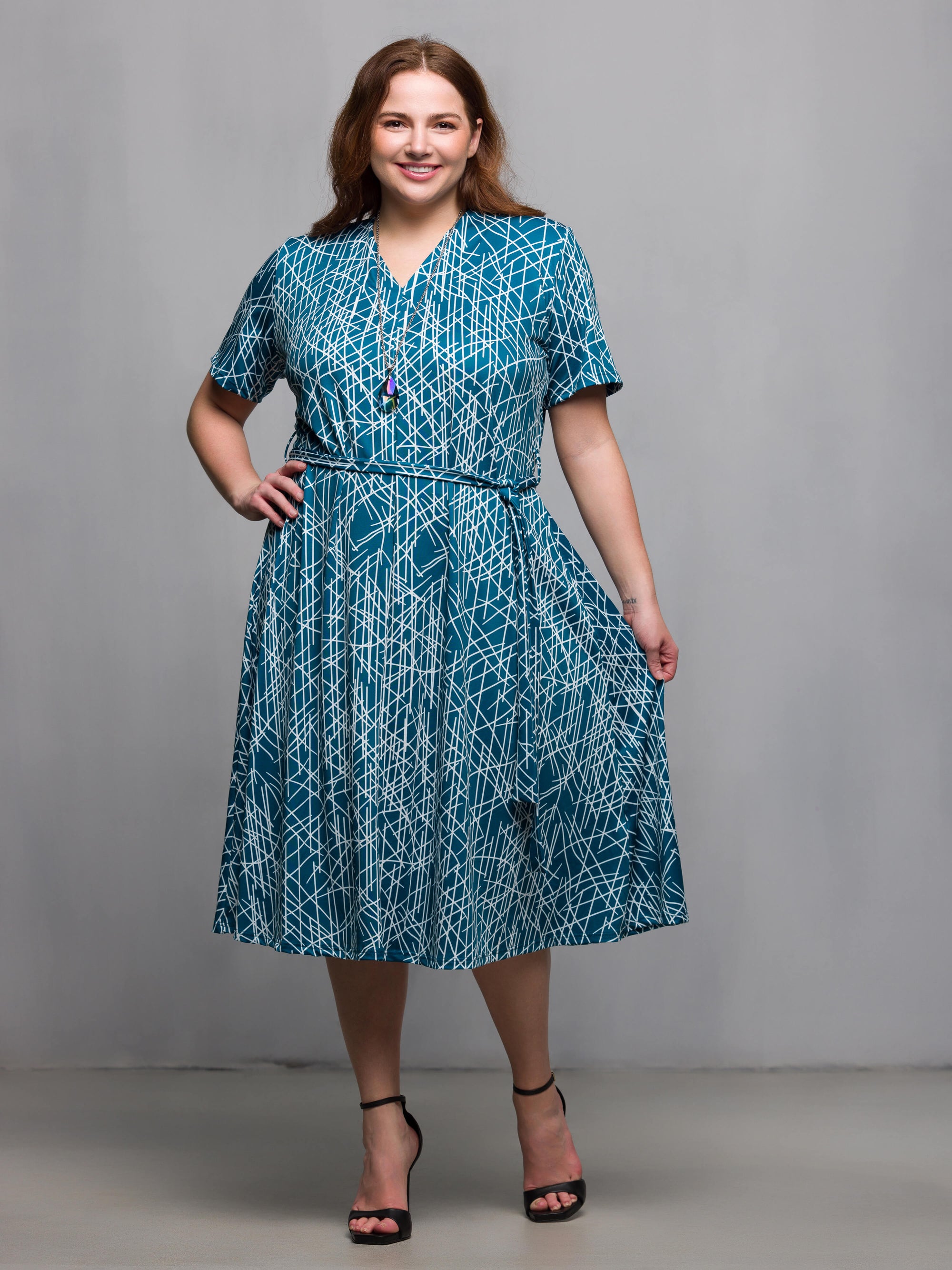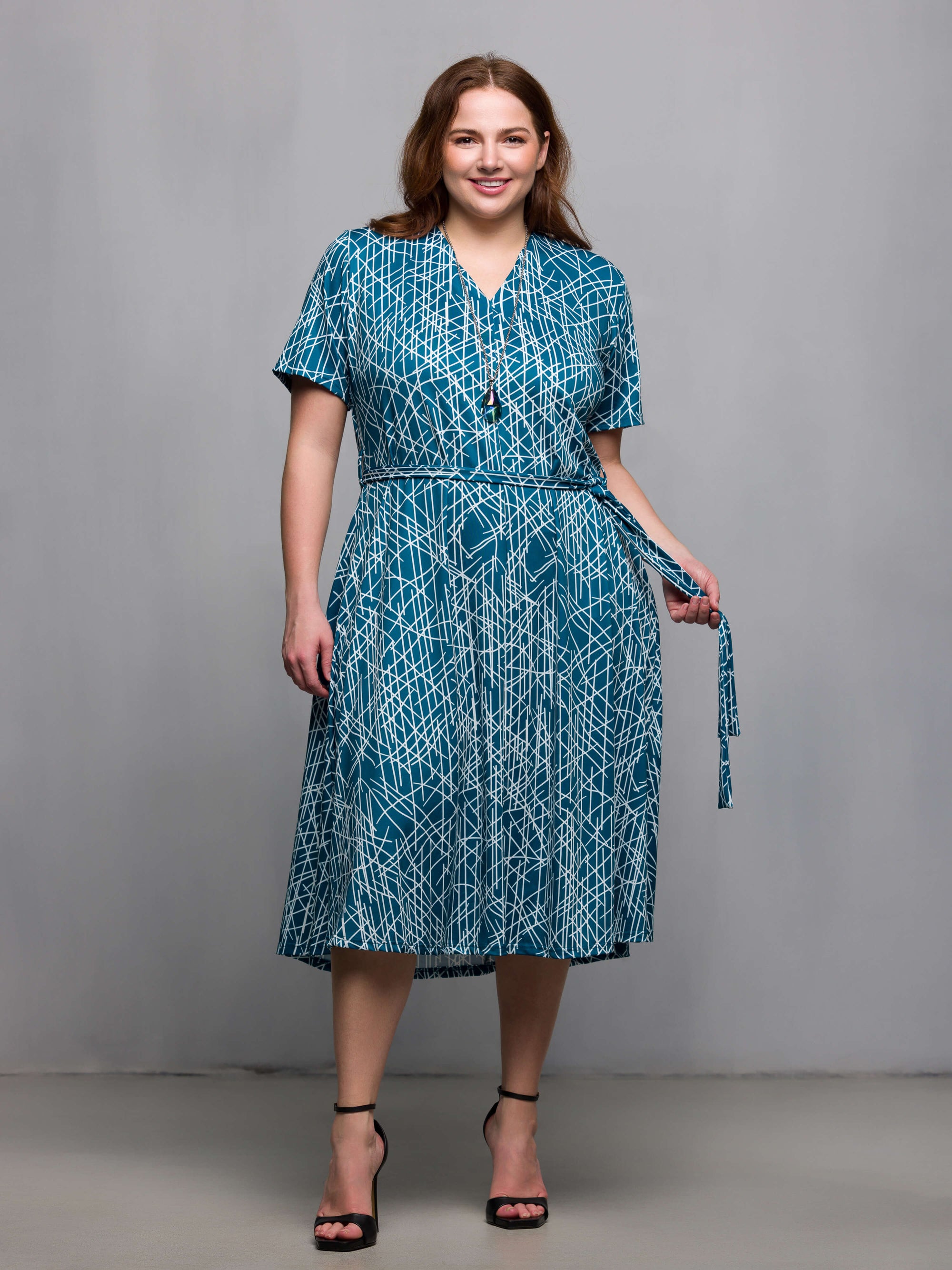 24seven Comfort Apparel Plus Size Teal Print Short Sleeve Tie Waist Midi Dress