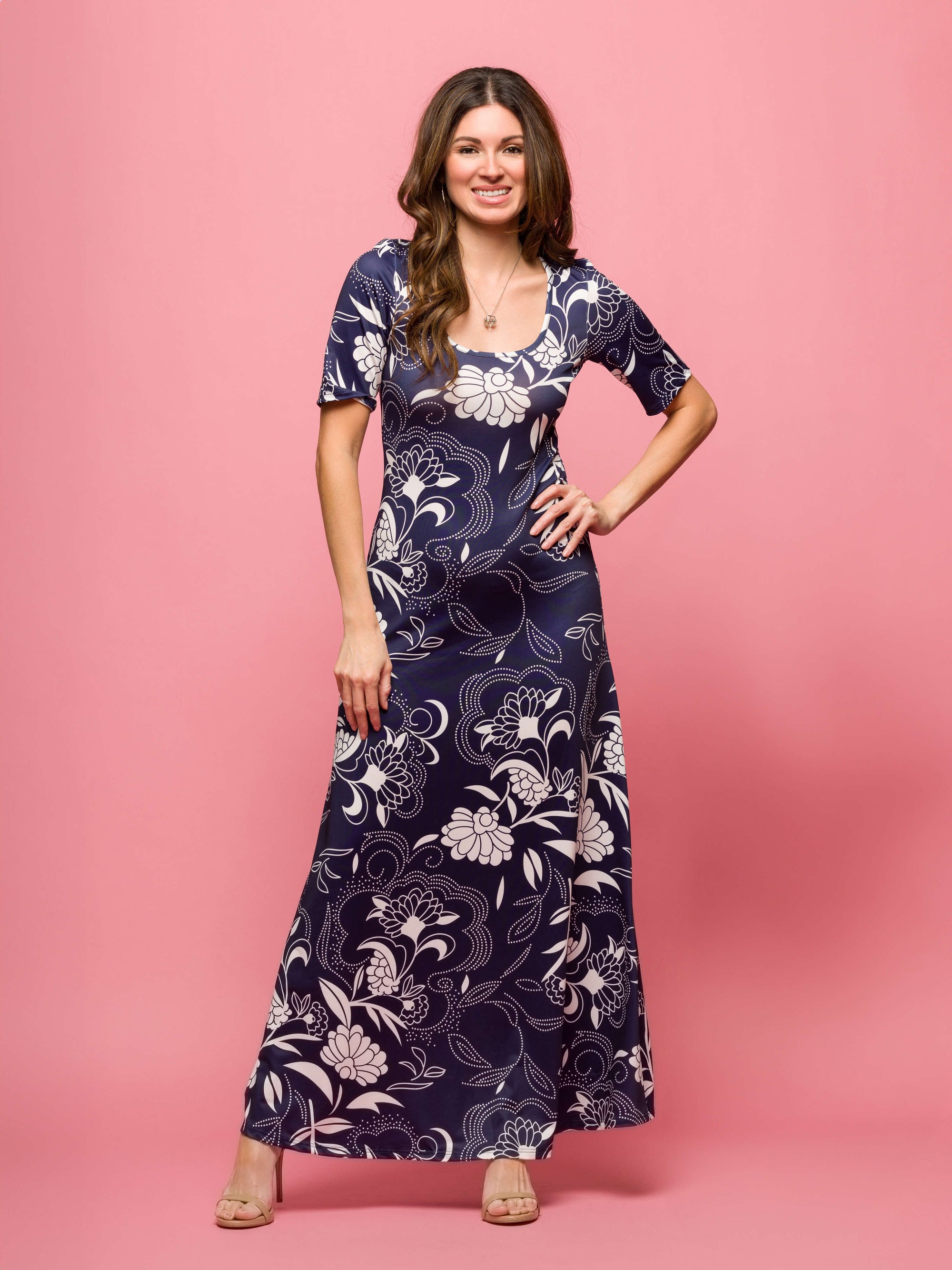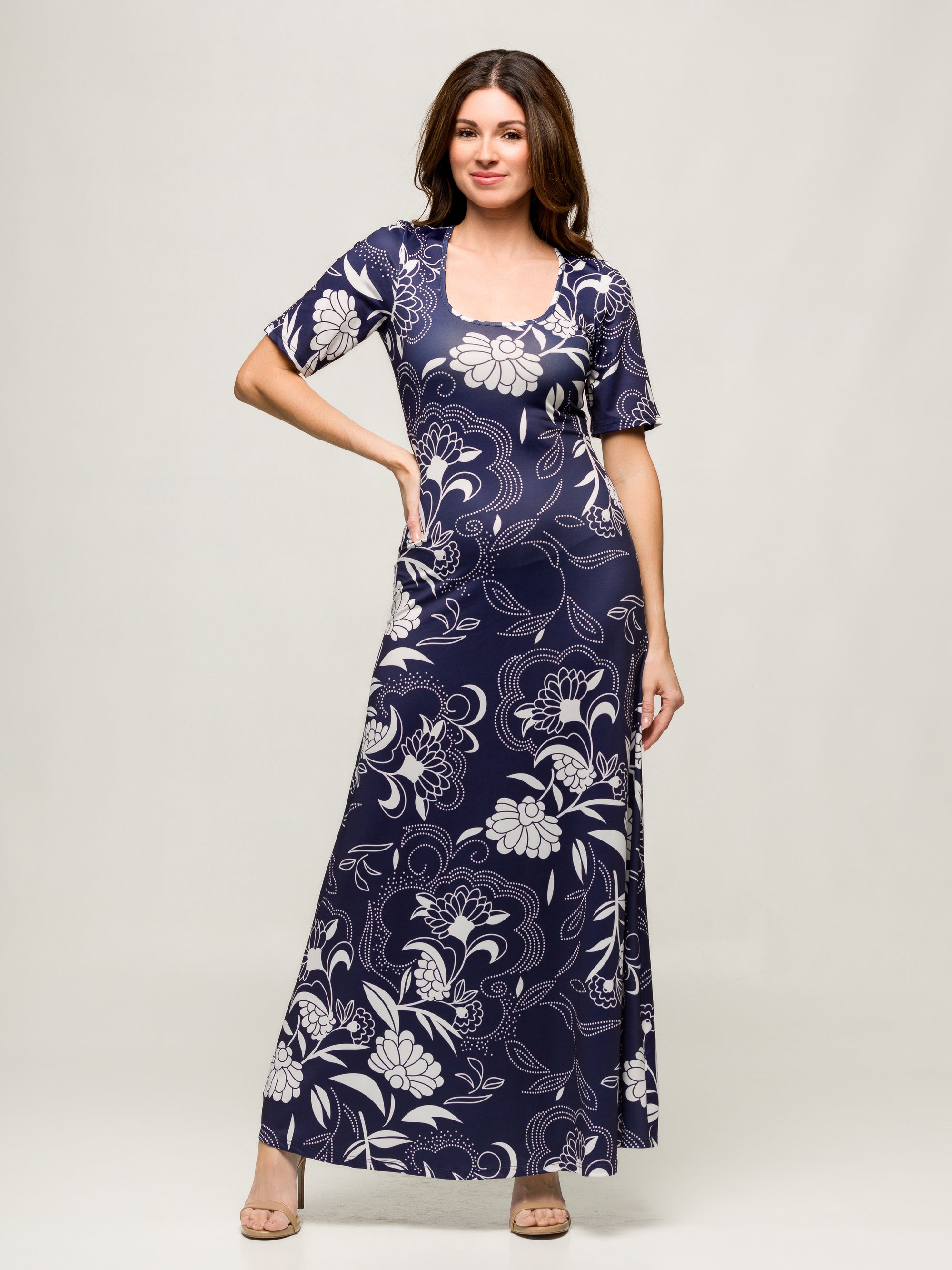 24seven Comfort Apparel Navy Floral Print Elbow Sleeve Casual A Line Maxi Dress