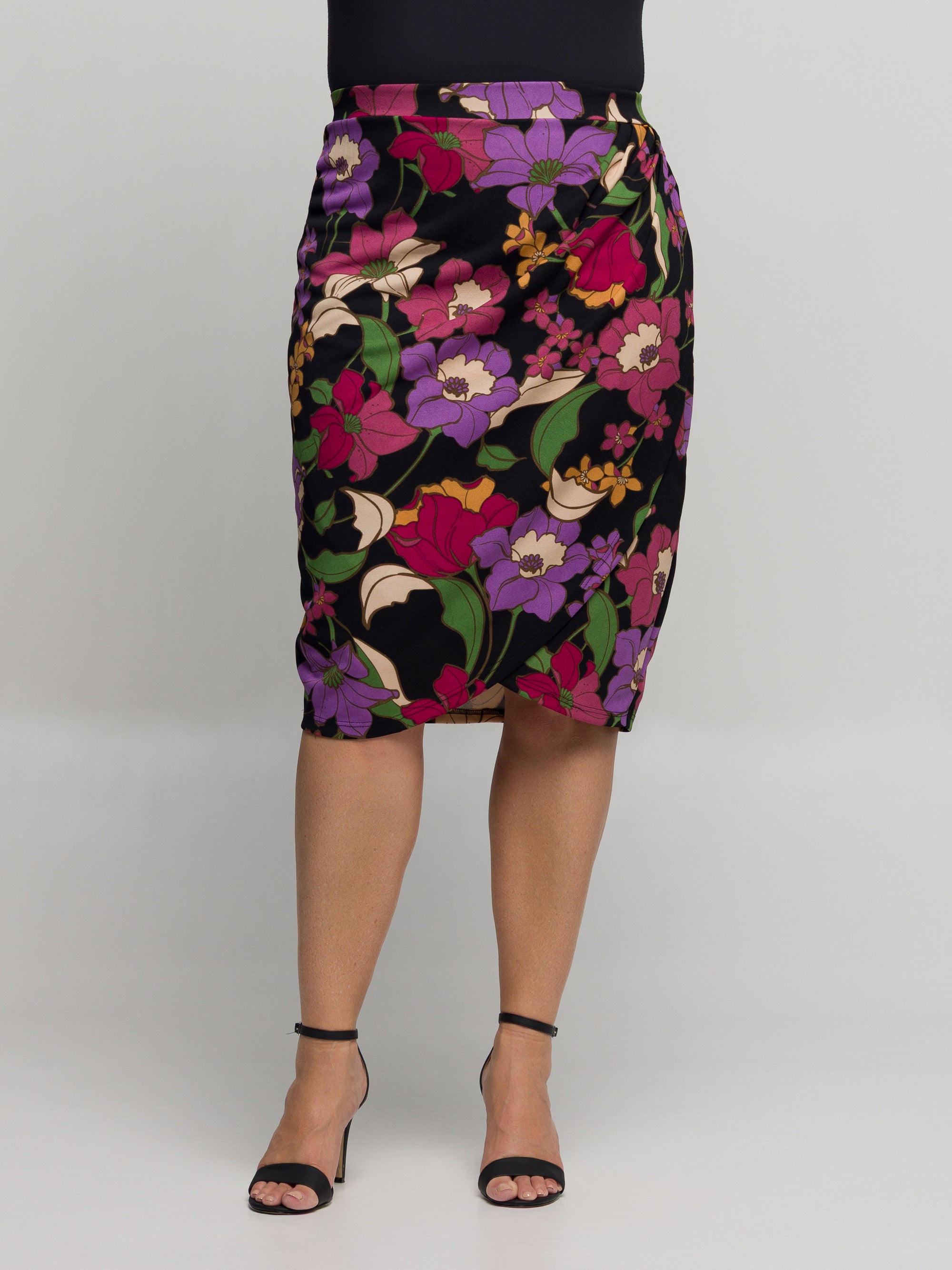 24seven Comfort Apparel Plus Size Black Multi Floral Print Midi Pencil Skirt