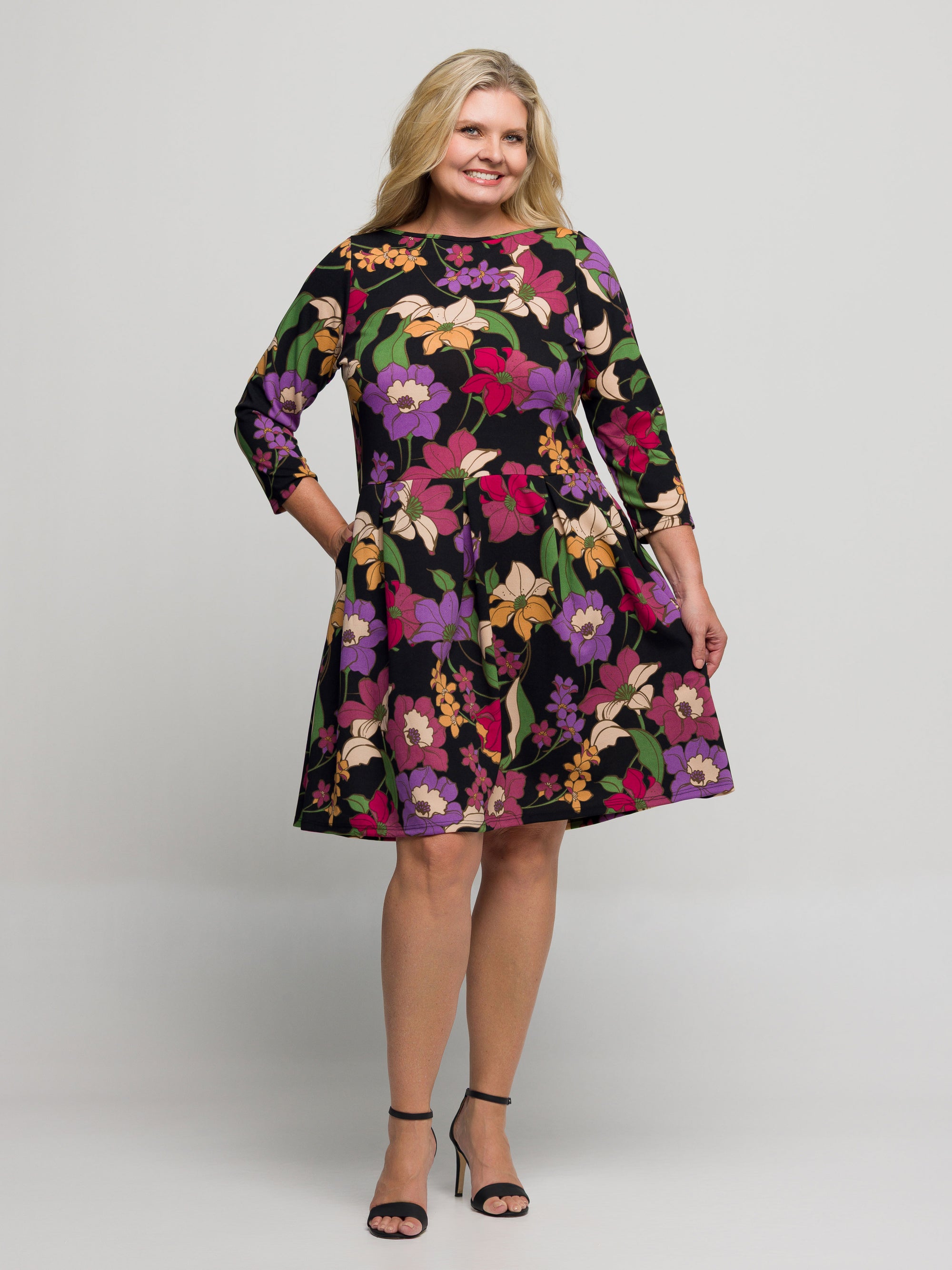Plus Size Black Multicolor Floral Fit and Flare Pocket Knee Length Dress