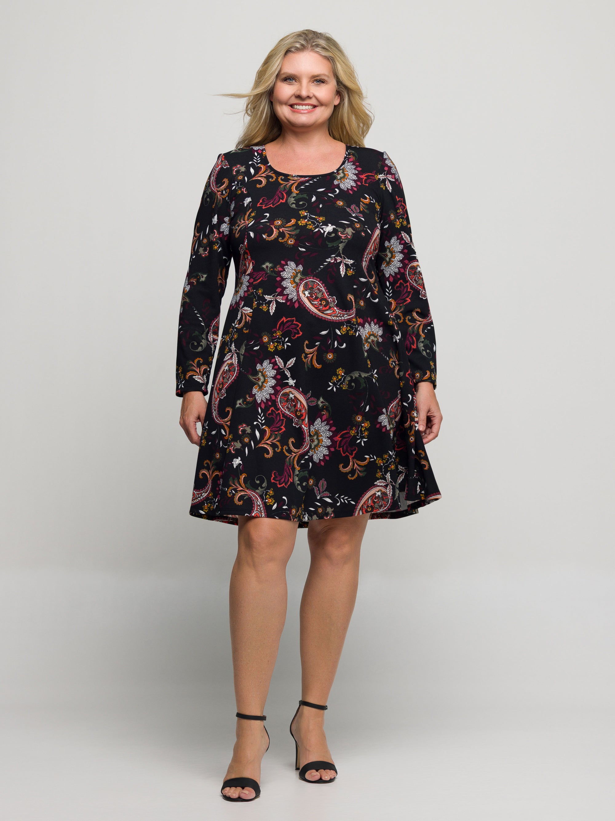 24seven Comfort Apparel Plus Size Black Paisley Print Long Sleeve Fit and Flare Dress