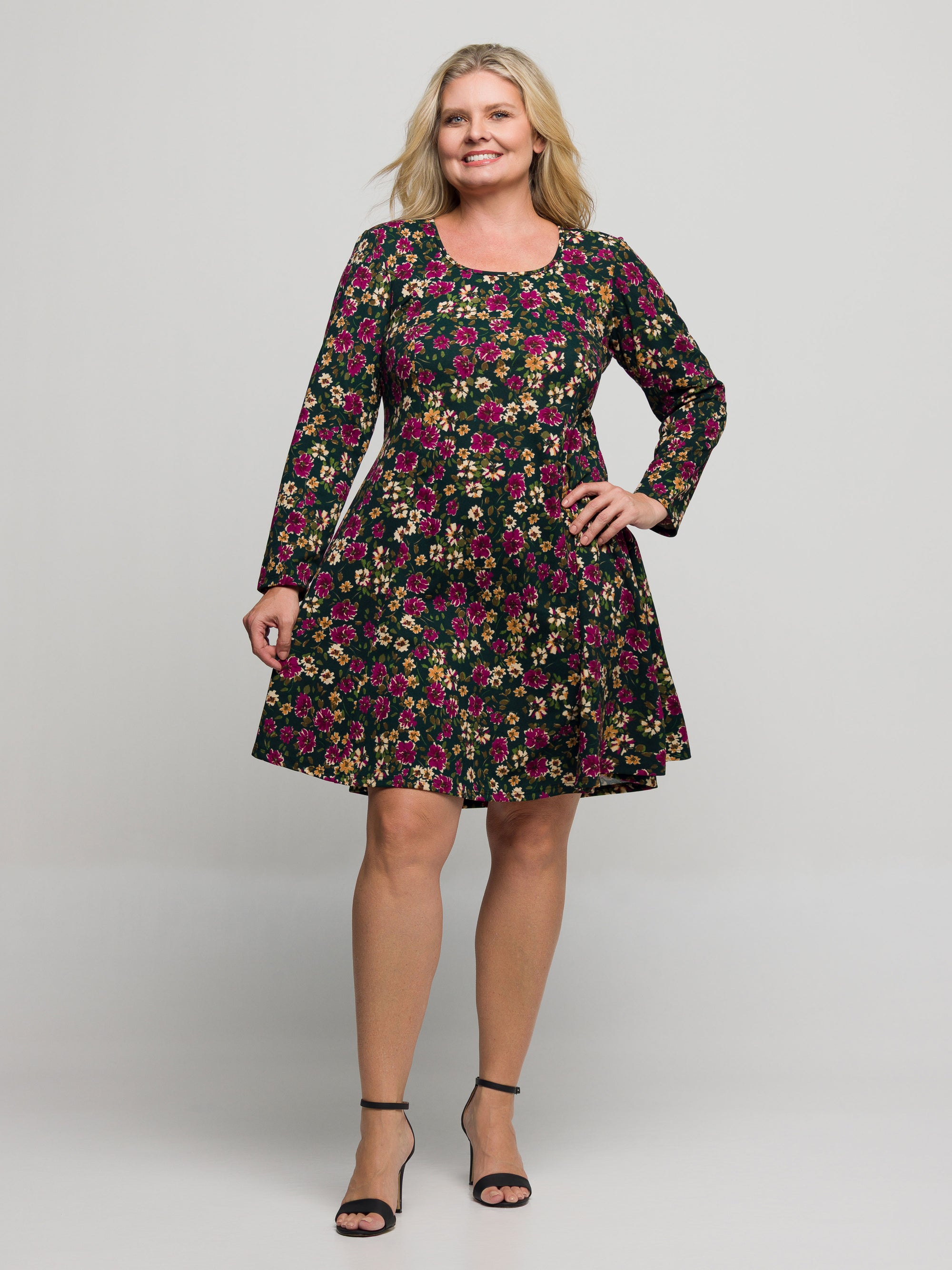 Plus Size Long Sleeve Fit and Flare Dress in Green Orange Floral Print
