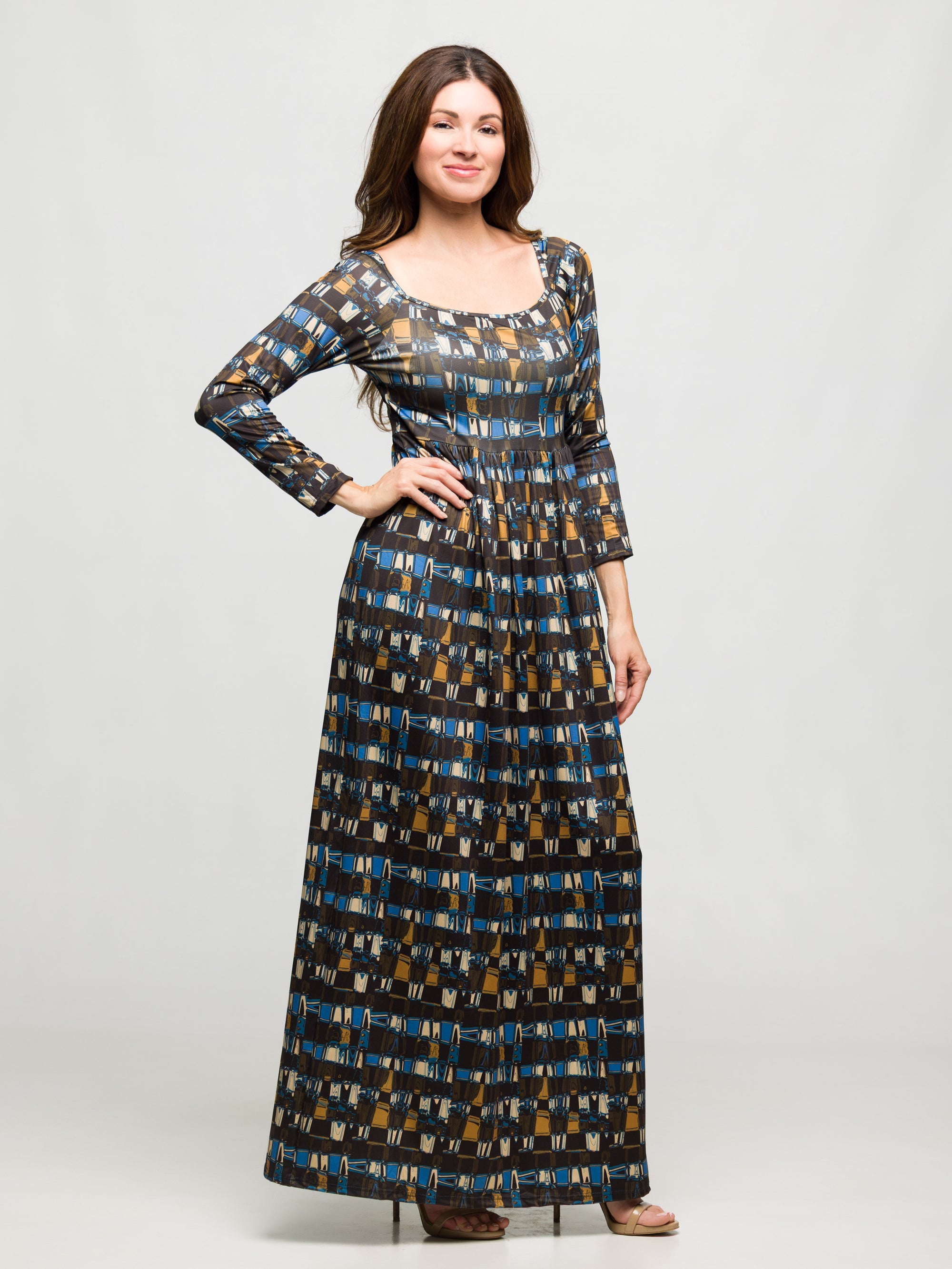 24seven Comfort Apparel Brown Geometric Print Long Sleeve Empire Waist Maxi Dress