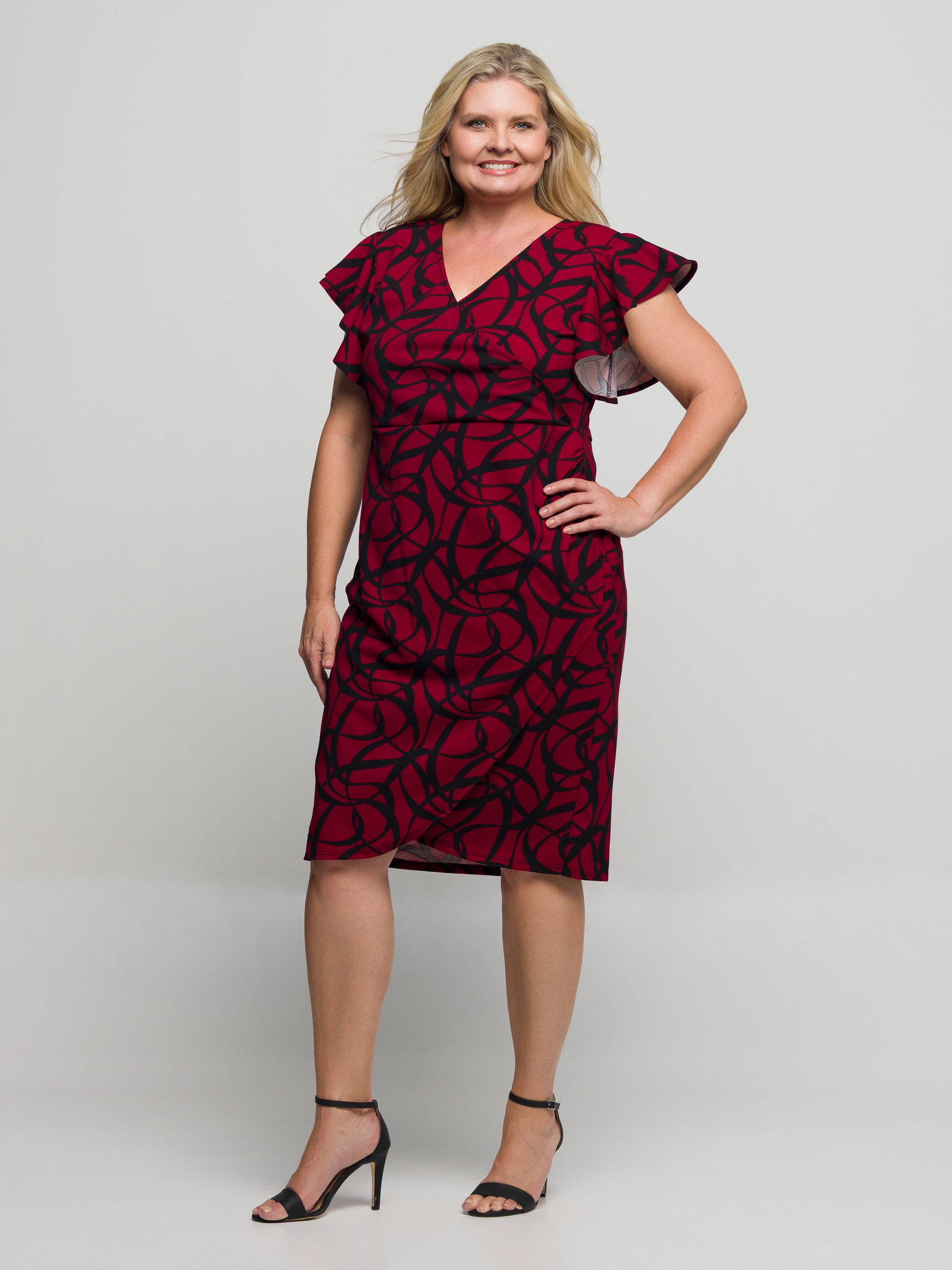 24seven Comfort Apparel Plus Size Burgundy Print Flutter Sleeve Faux Wrap Dress