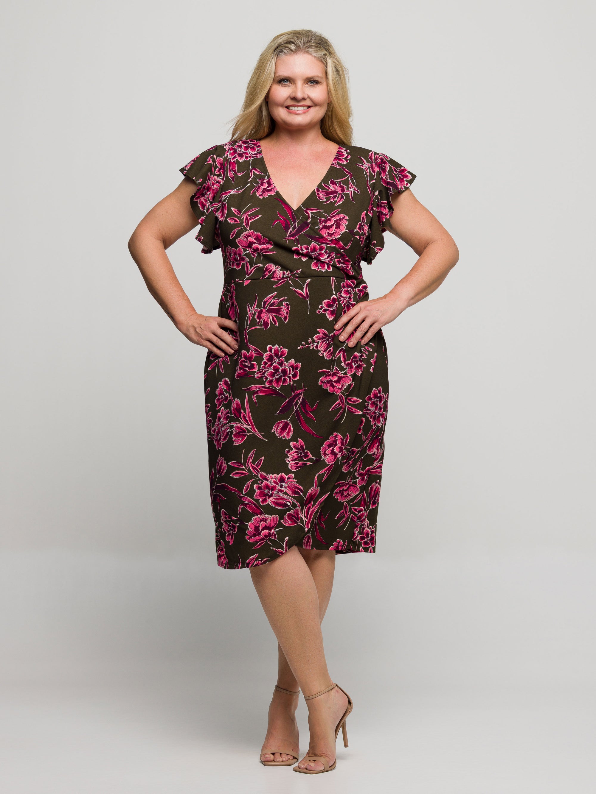 24seven Comfort Apparel Plus Size Brown and Pink Floral Flutter Sleeve Wrap Dress