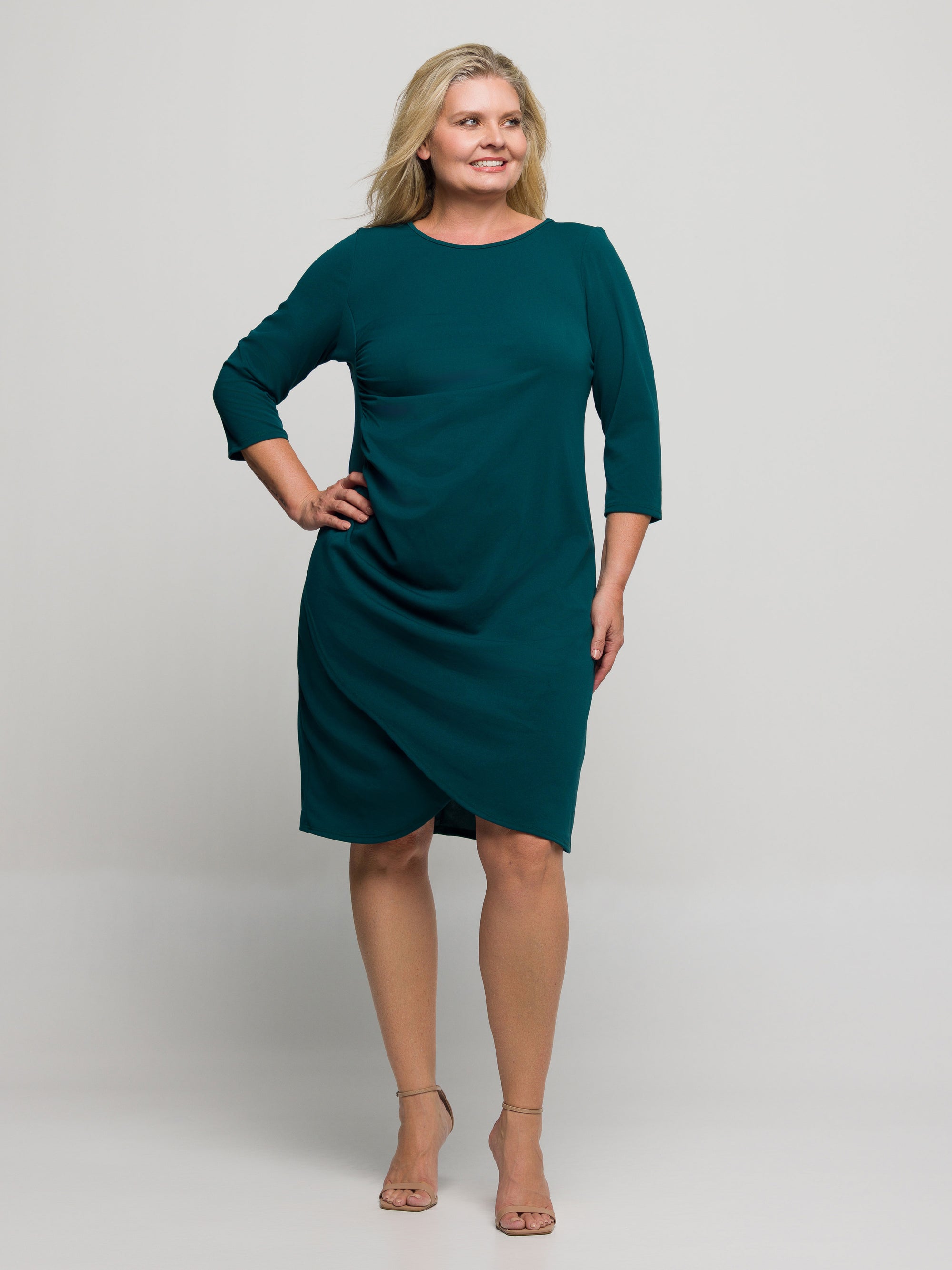 24seven Comfort Apparel Plus Size Three Quarter Sleeve Ruched Tulip Hem Mini Dress