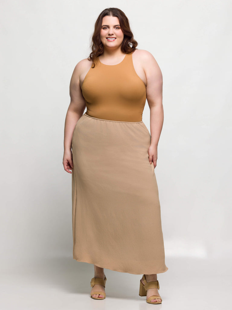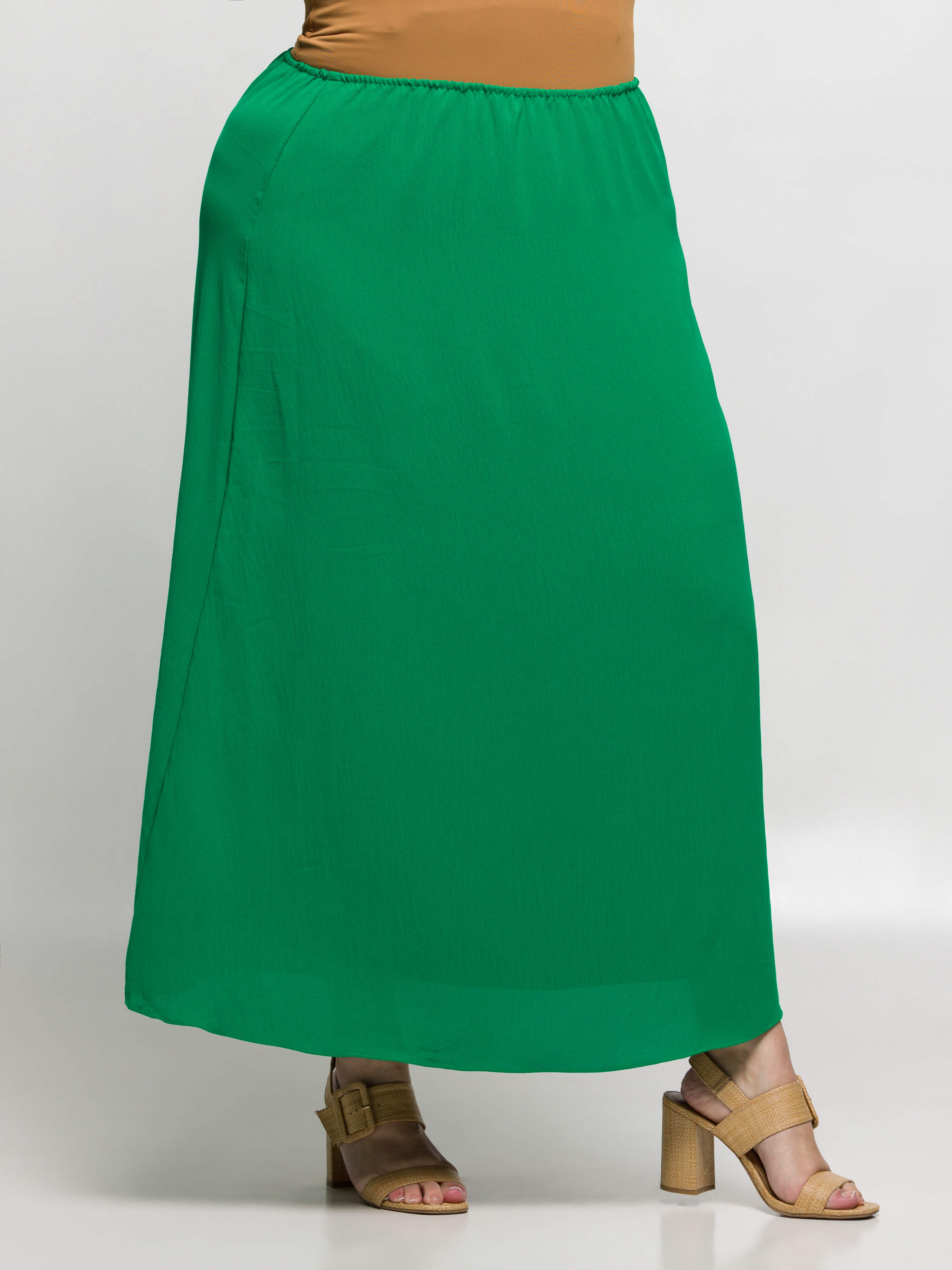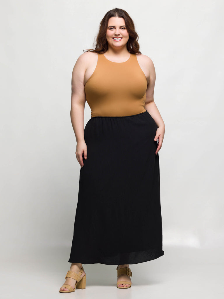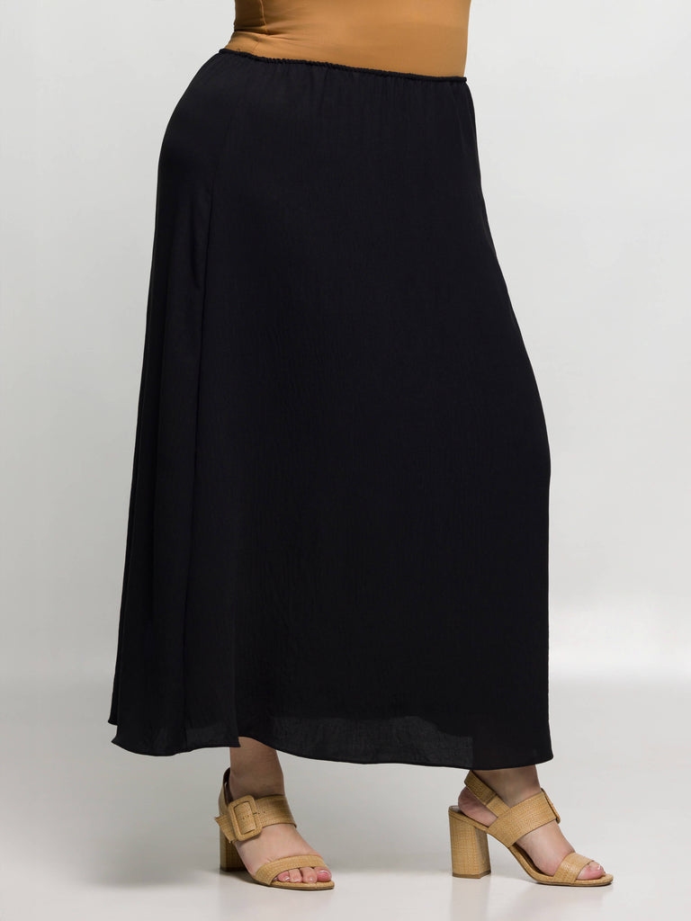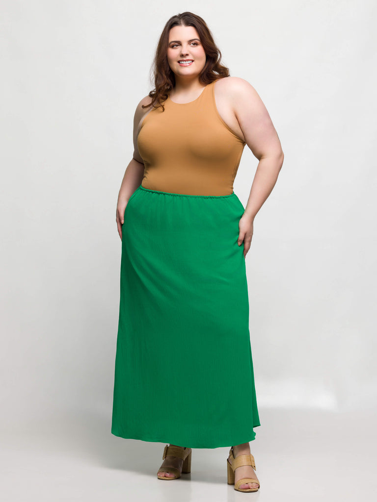 The Elastic Waist A Line Plus Size Maxi Skirt is your go to piece for effortless style and comfort. Featuring a flexible elastic waistband, this ankle length skirt provides a secure and flattering fit for all day wear. The lightweight fabric and built in slip lining ensure comfort and modesty, while the classic A line silhouette adds timeless charm. Perfect for summer outings or elegant evenings, this maxi skirt is a versatile addition to your wardrobe.
