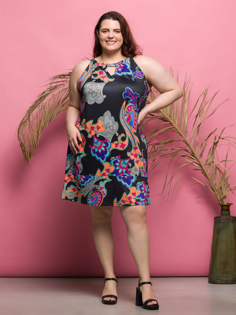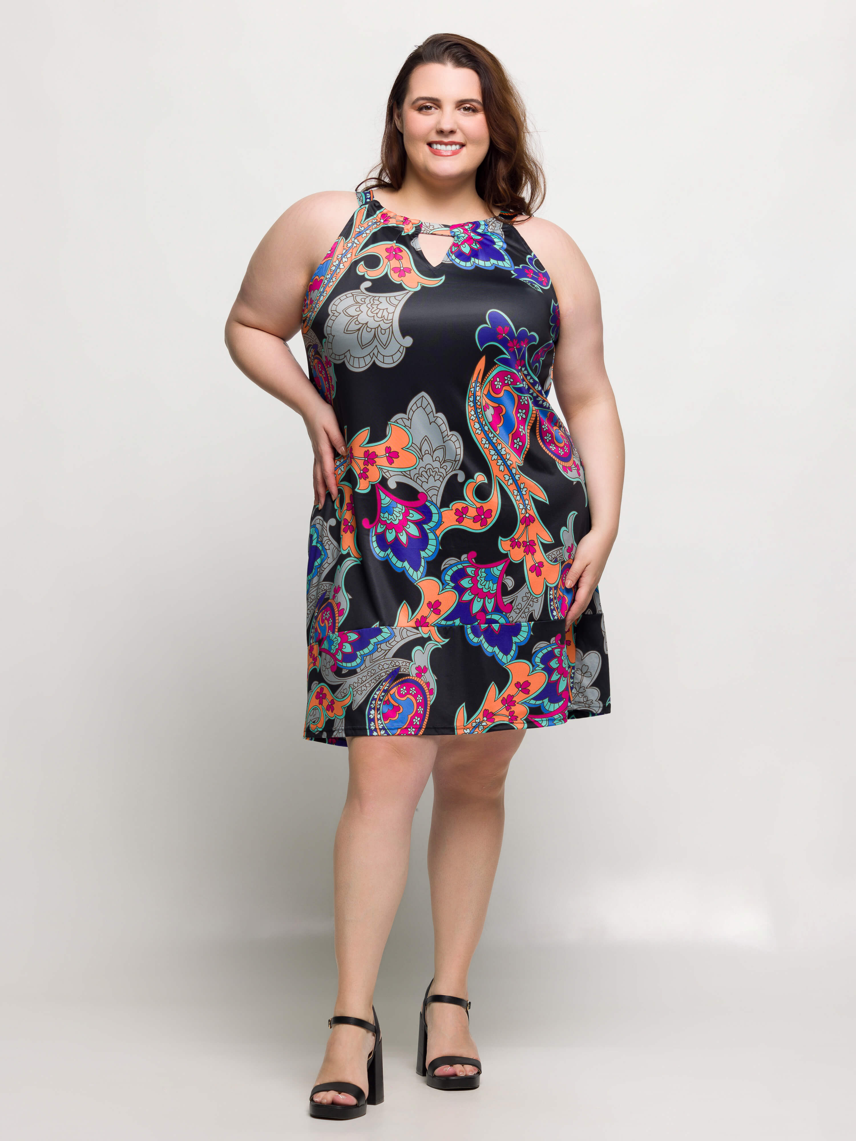 Add a touch of sophistication to your wardrobe with the Knee Length Black Paisley Print Sleeveless Keyhole Plus Size Dress. Featuring a bold paisley pattern, this dress boasts a flattering round neckline with a chic keyhole detail that elevates its classic design. The knee length shift silhouette and loose fit make it perfect for staying cool and comfortable on warm days. Crafted from a soft polyester blend, this sleeveless dress is an easy choice for summer outings or casual evenings.
