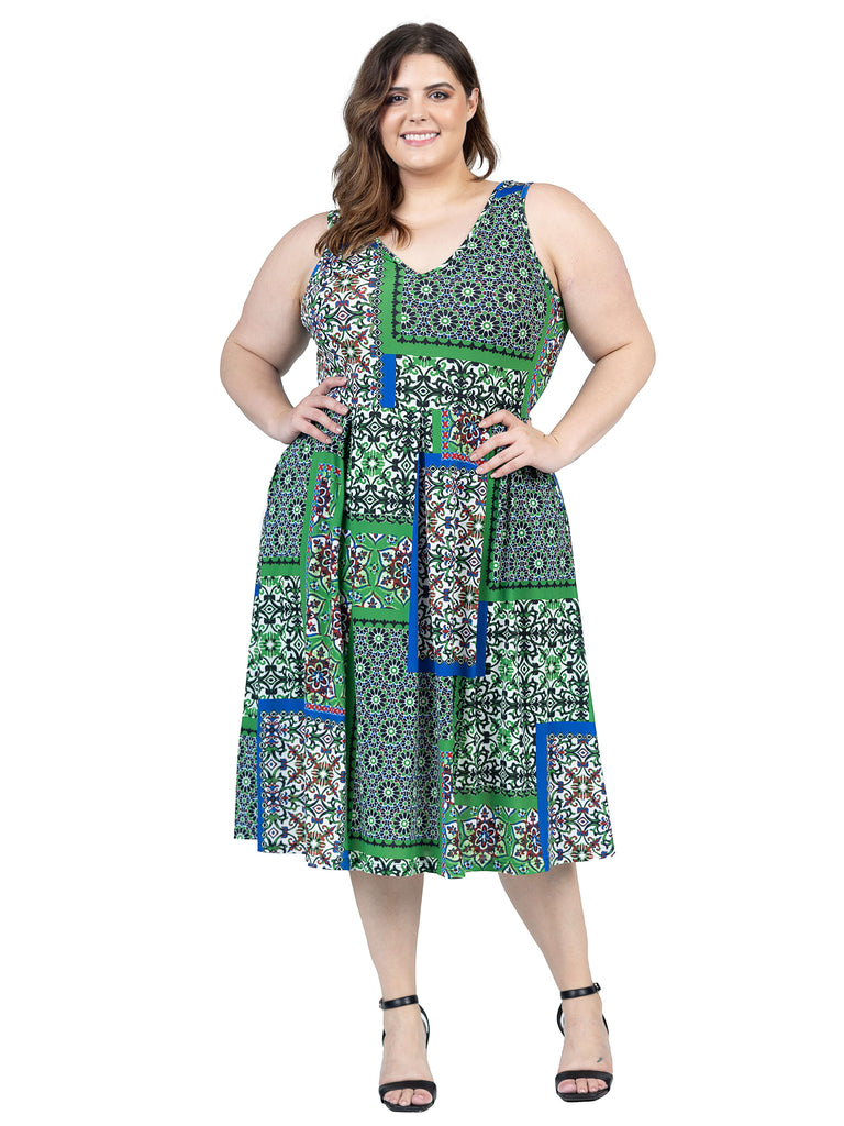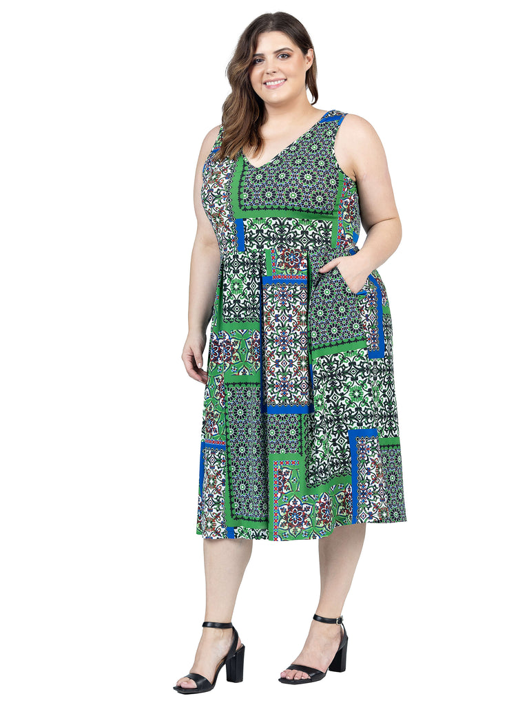 Plus Size Midi Length Green Scarf Print Sleeveless Pleated Pocket Dress